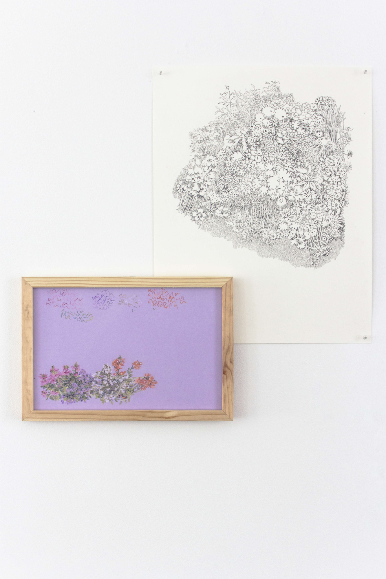 Crayon de couleur sur papier mauve, 21 x 14,8 cm