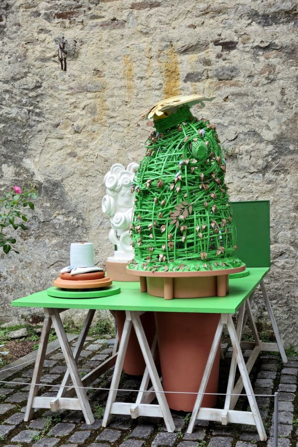 L’atelier, coin du monde propose une évocation d’un fragment d’atelier de confection. Un atelier qui était installé de 1920 à 1960 dans la partie gauche du jardin actuel. Cette évocation, interprète librement la mémoire de la Maison du patrimoine, un atelier de confection. Une tête perruquée blanche rappelle la statuaire de marbre du XVII ème, le mannequin de Daphné se transforme en buisson en échappant à Apollon et inscrit la pièce dans les massifs de fleurs du jardin actuel.. Ce contexte permet d’associer et de croiser diverses techniques et matériaux — bois, céramique…