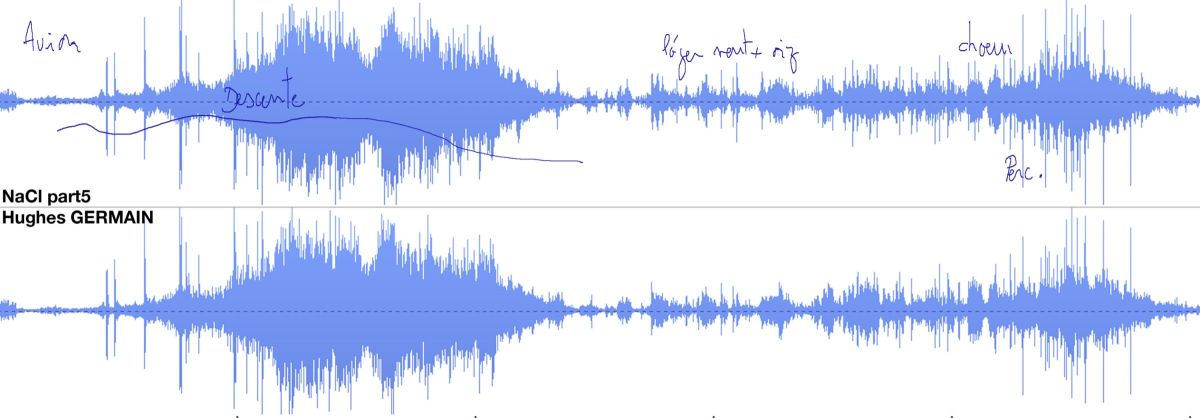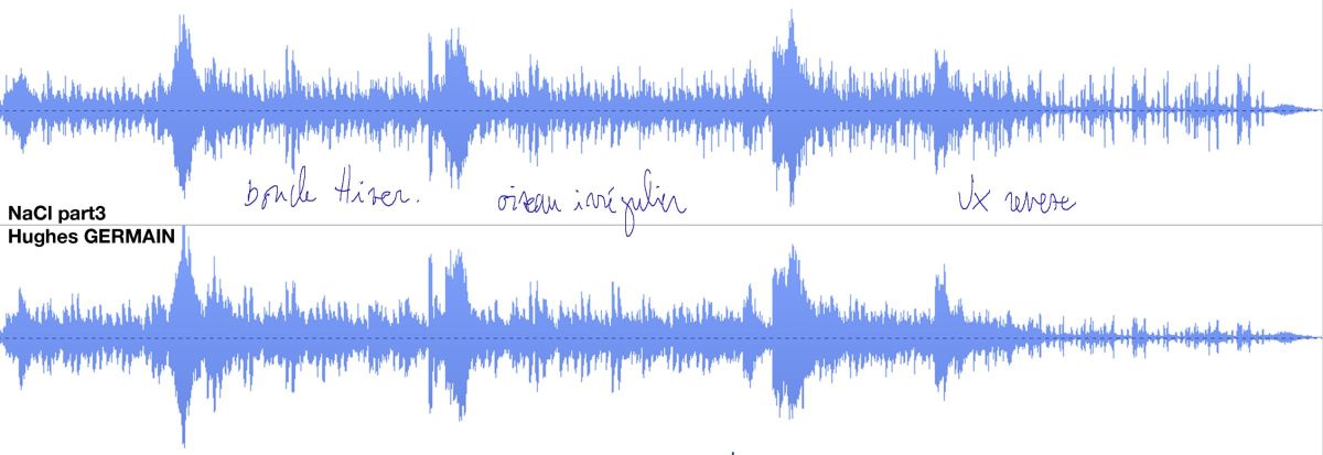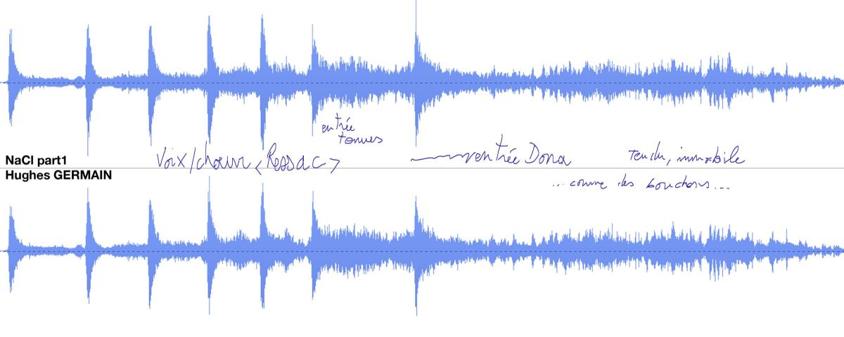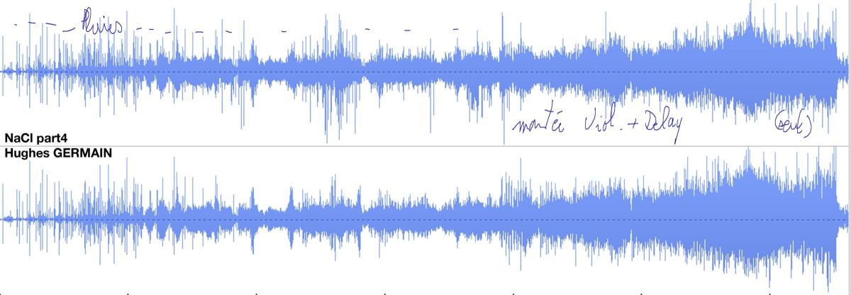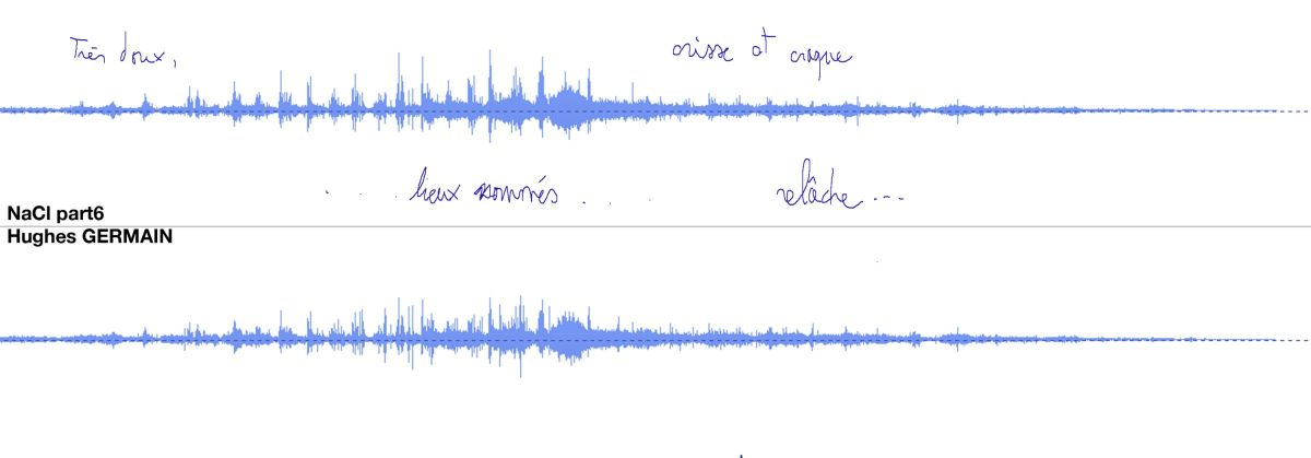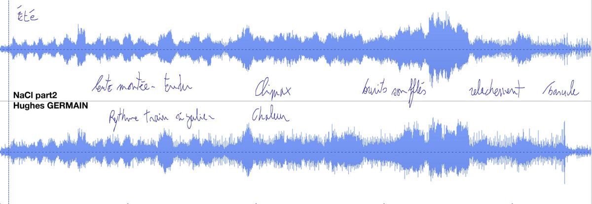 Pour électroacoustique seule. C’est une recherche serrée des sons proches d’un bruit blanc sur le territoire des marais salants de Guérande. La mer en est très proche sans qu’on l’entende jamais, et pourtant tous les sons semblent s’y rattacher, en provenir.