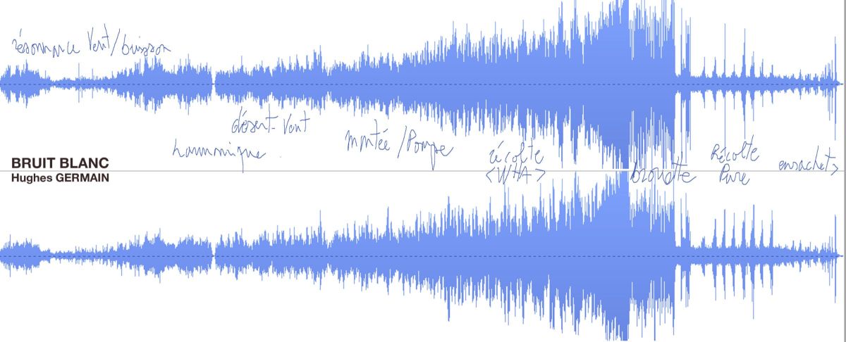 Depuis 1998, Hughes Germain travaille sur le paysage sonore des marais salants de Guérande. En collectant des sons régulièrement, à différentes périodes de l’année, du jour, de la nuit, il est arrivé à une compréhension sensible et singulière du lieu dans la durée. Ce paysage sonore, cadre de la collecte de sons, est significatif d’une vie animale et végétale mais aussi de l’activité humaine artisanale liée à la récolte du sel. L’attitude est d’enregistrer ce qui est là sur le moment avec le moins d’action possible, sans volonté documentaliste ou exhaustive, et d’extraire des données, qu’elles soient gestuelles, sonores, météorologiques, en excluant l’interview qui fait basculer dans un autre registre. Le travail sur les sons vise à les éloigner du directement reconnaissable, en conservant l’esprit d’un paysage sonore. Il s’agit bien d’être à la limite de l’abstraction, de faire le juste nécessaire pour que ces sons décollent d’une réalité documentaire, et ne soient pas l’évocation des marais salants mais l’image d’un processus délicat, toujours différent.