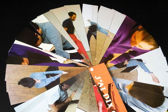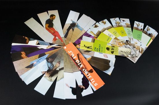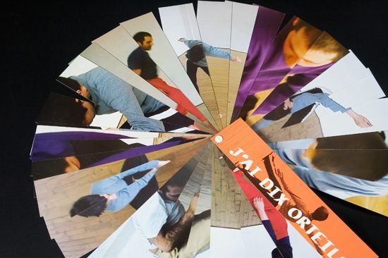 J’ai dix orteils est un livre-objet adressé aux enfants à partir de 5 ans. Il propose un point de vue sur la singularité du/des corps en mouvement. Conçu comme un nuancier de 248 images, 27 mots et 72 couleurs, il combine toute une série de variations visuelles autour du mouvement dansé. Un des côtés est composé d’images, de mots et de couleurs, l’autre de grandes images réparties sur 3 pages. J’ai dix orteils se manipule au sol de préférence, et dans tous les sens.