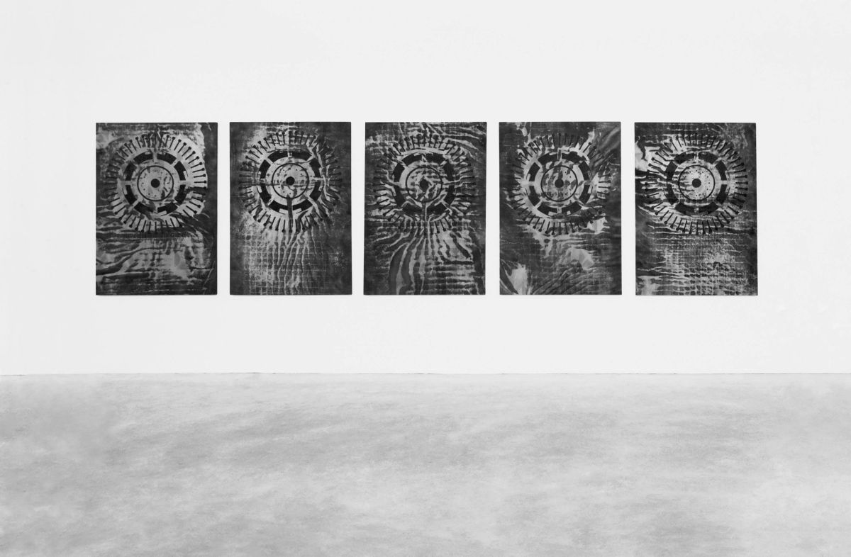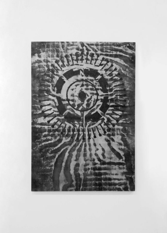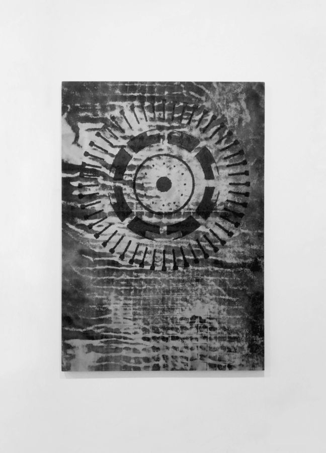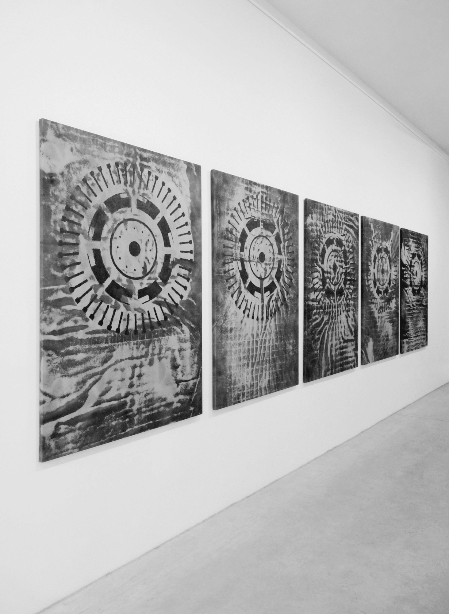 Le choix du motif géométrique noir obtenu à l’aide d’un pochoir, et répété cinq fois, n’a pourtant rien de rassurant. Pareille à une pupille dilatée de cyclope, la forme peinte, relativement hypnotique, semble nous fixer, nous surveiller.