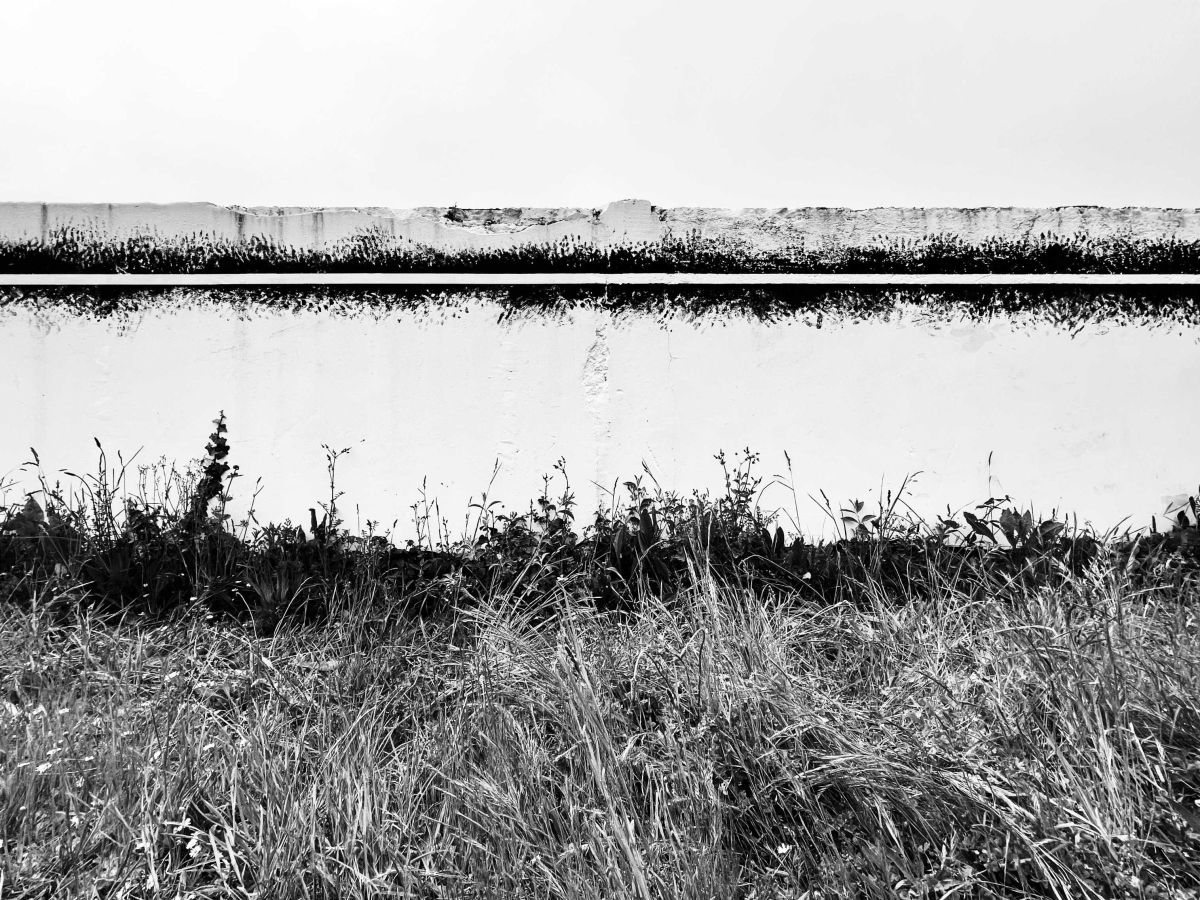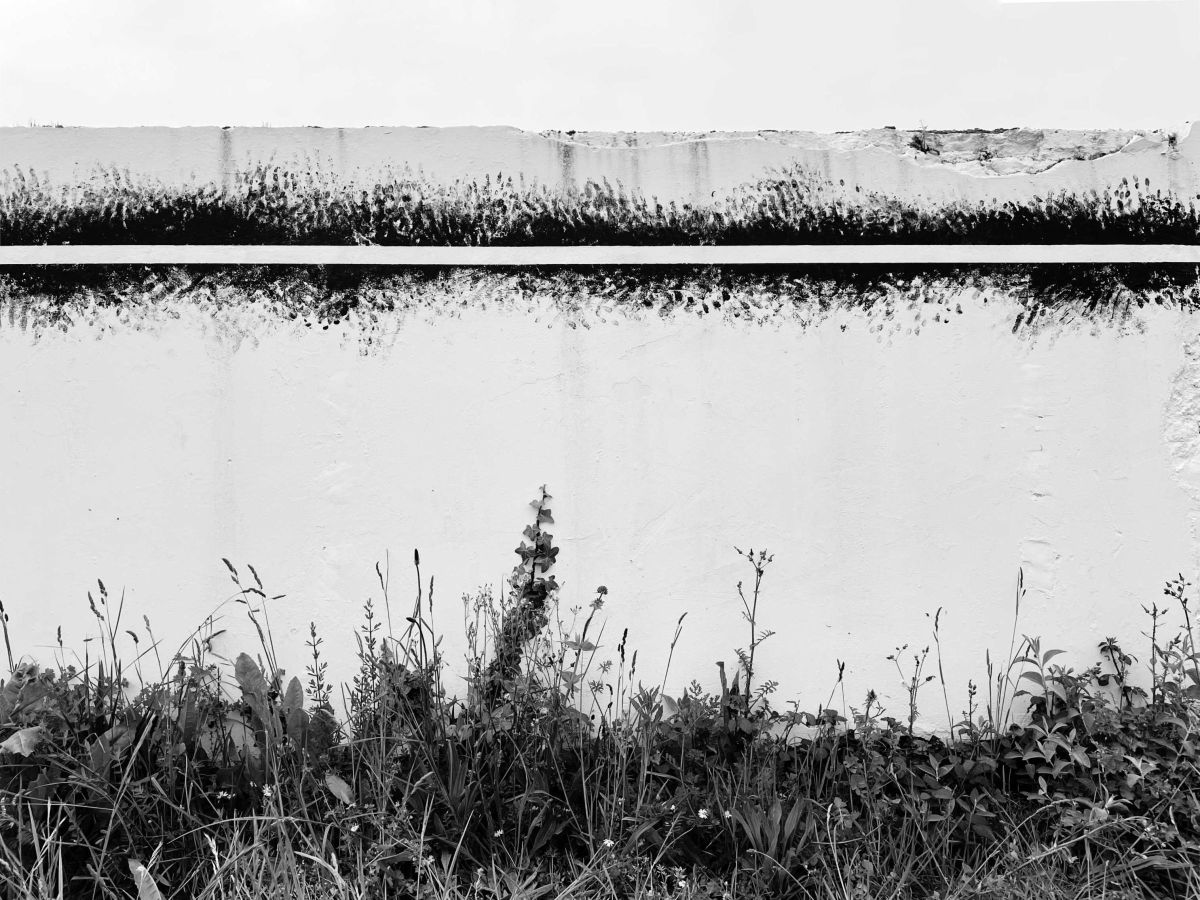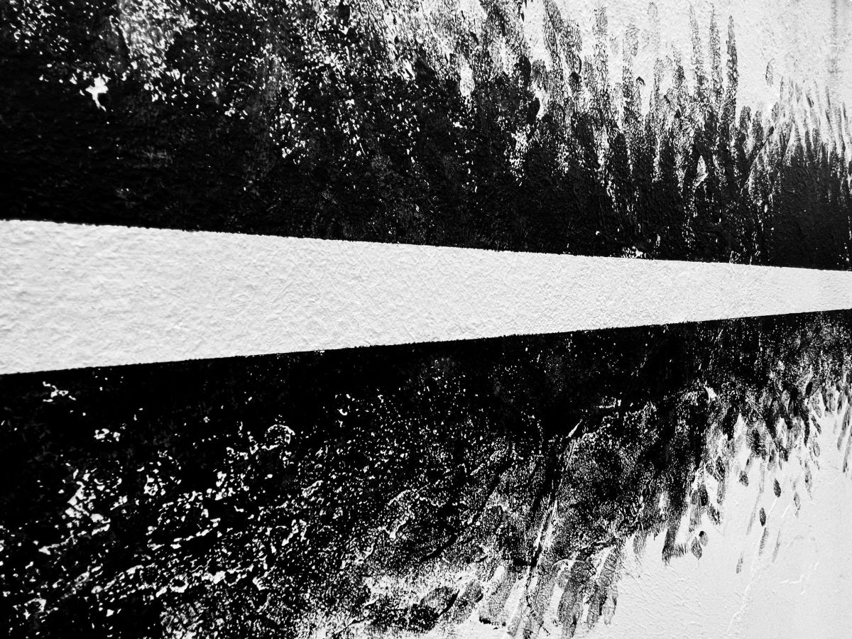 . Ici, on se joue de la peinture. Cette dernière, noire, est apposée à la main, par tâtonnements, à même le mur et à hauteur de regard. Il s’agit de proposer une forme d’horizon scopique, une ligne blanche qui restitue visuellement une partie du support occupé.