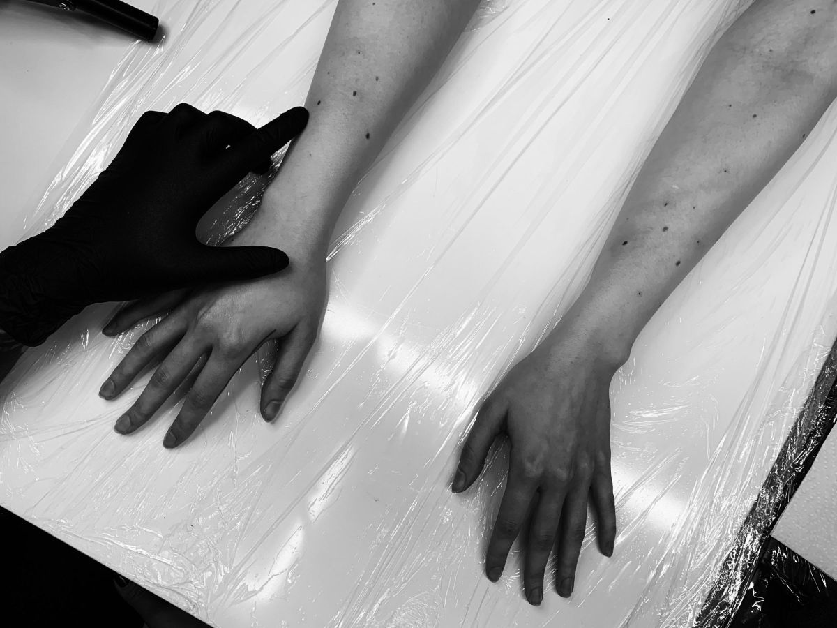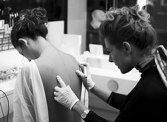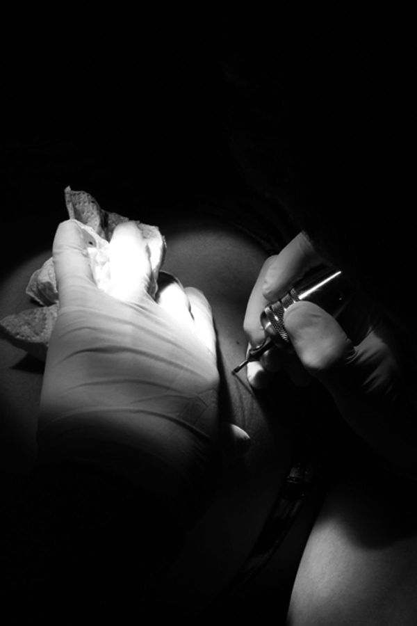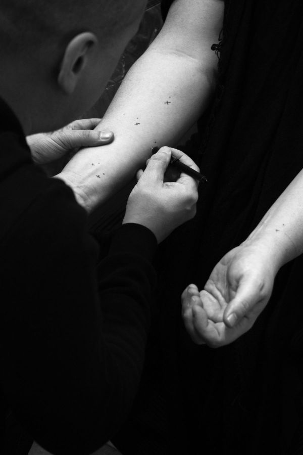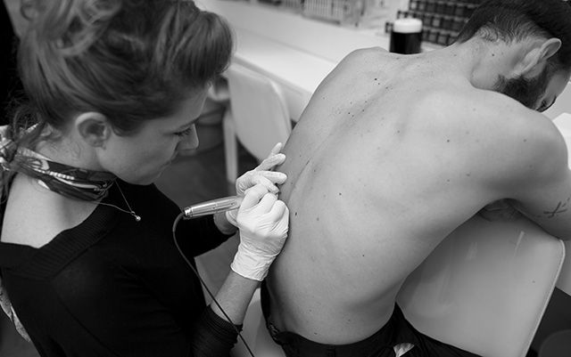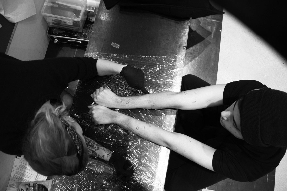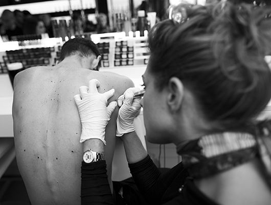 Action. Tatouages in situ : reproduction symétrique des grains de beauté existants sur le corps d’un modèle
