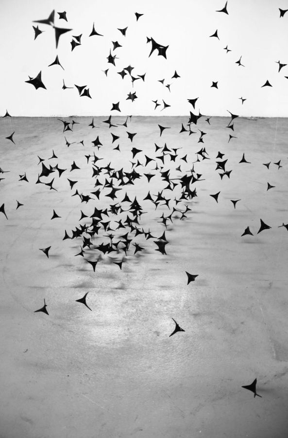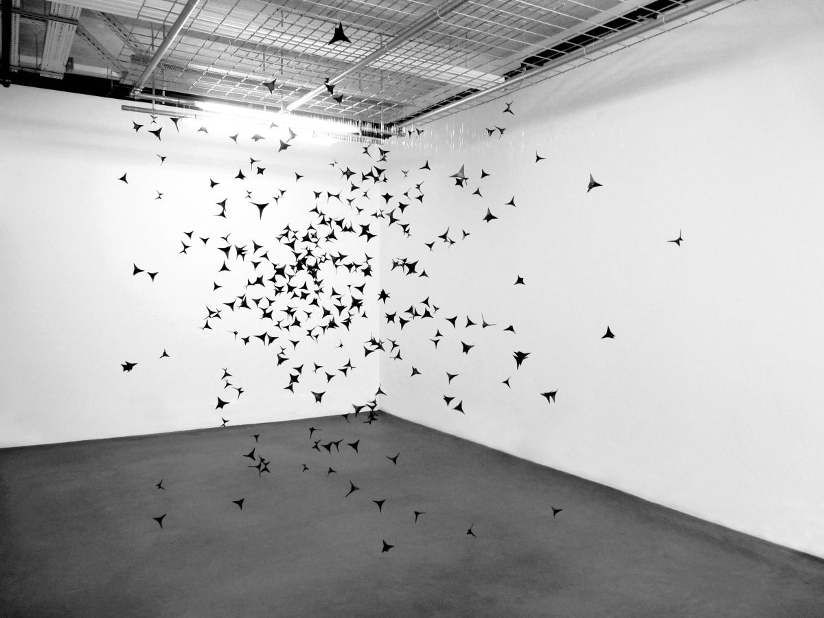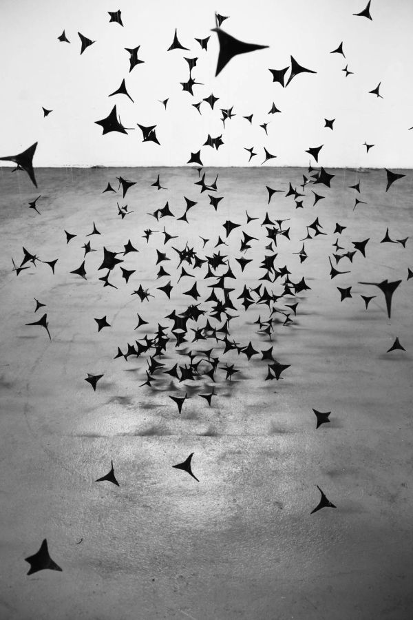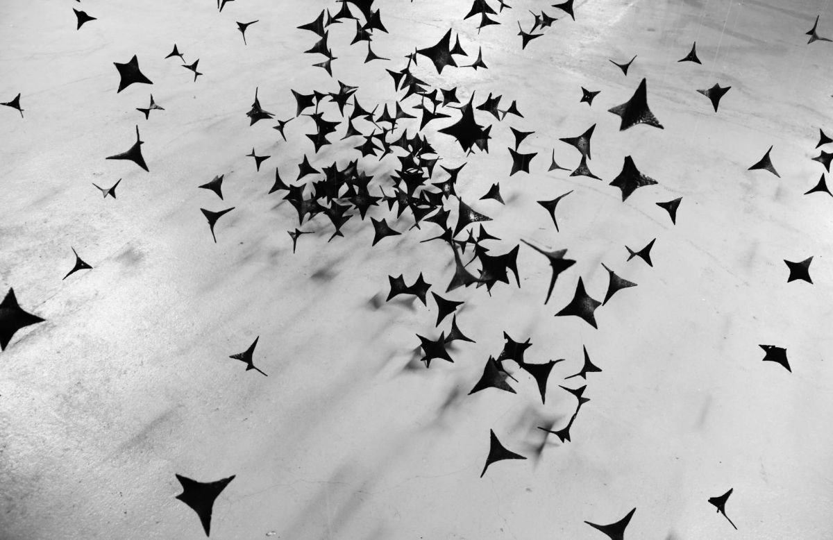 350 objets énigmatiques, à quatre branches peints en noir, sont suspendus au sein de l’espace d’exposition. Ce sont des chausse-trappes allemands trouvés aux abords d’un chemin, à fleur de terre, non loin de Verdun. Ces armes ancestrales blessaient les pieds des hommes comme des chevaux. John Cornu en détourne la fonction originelle et en désamorce la nature dangereuse par un geste à la fois documentaire, artistique et mémoriel : la suspension. « Brume », ce mobile léger et élégant, fige l’explosion dans son mouvement meurtrier et brouille la perception de l’espace dans lequel elle se déploie. La légèreté vaporeuse qu’elle inspire dissimule, à peine, les stigmates de son vieillissement et une histoire à charge, agressive et sournoise.