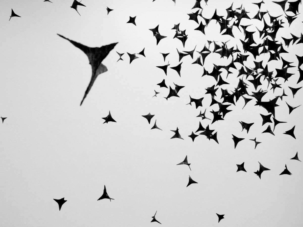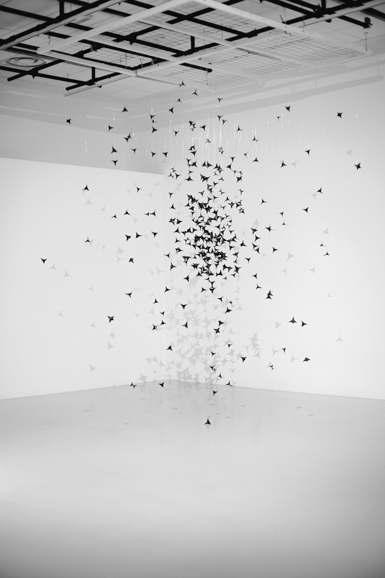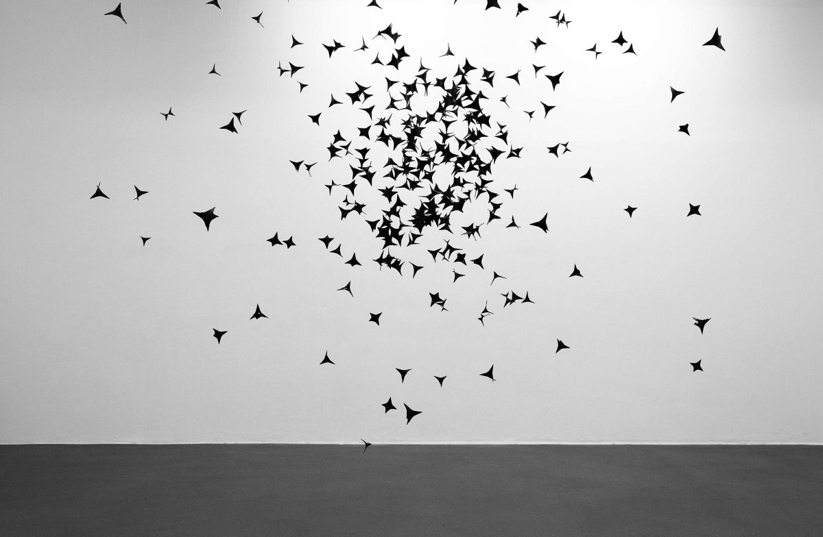 350 objets énigmatiques, à quatre branches peints en noir, sont suspendus au sein de l’espace d’exposition. Ce sont des chausse-trappes allemands trouvés aux abords d’un chemin, à fleur de terre, non loin de Verdun. Ces armes ancestrales blessaient les pieds des hommes comme des chevaux. John Cornu en détourne la fonction originelle et en désamorce la nature dangereuse par un geste à la fois documentaire, artistique et mémoriel : la suspension. « Brume », ce mobile léger et élégant, fige l’explosion dans son mouvement meurtrier et brouille la perception de l’espace dans lequel elle se déploie. La légèreté vaporeuse qu’elle inspire dissimule, à peine, les stigmates de son vieillissement et une histoire à charge, agressive et sournoise.