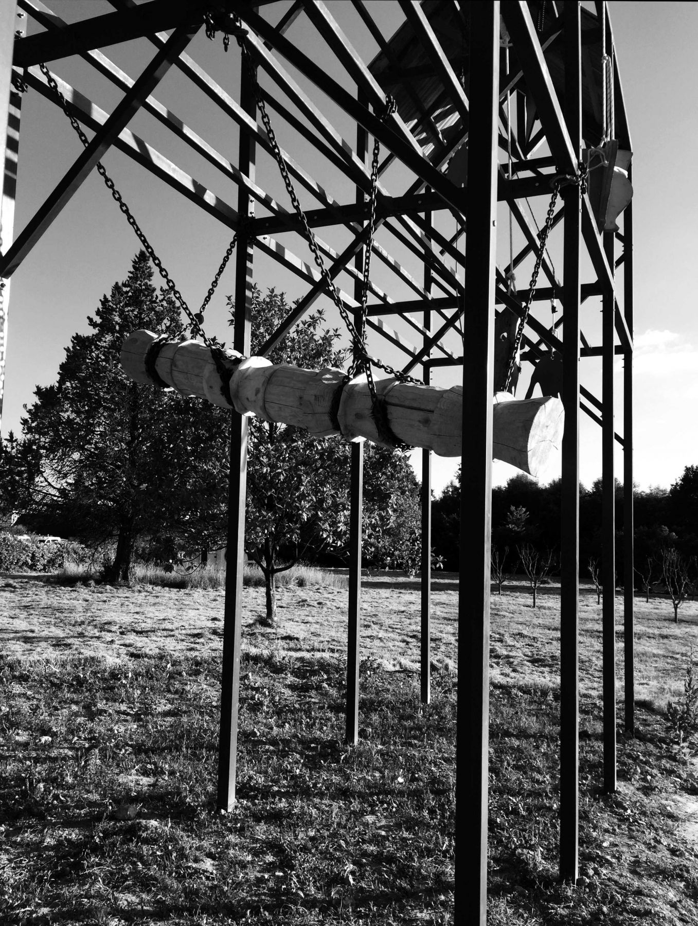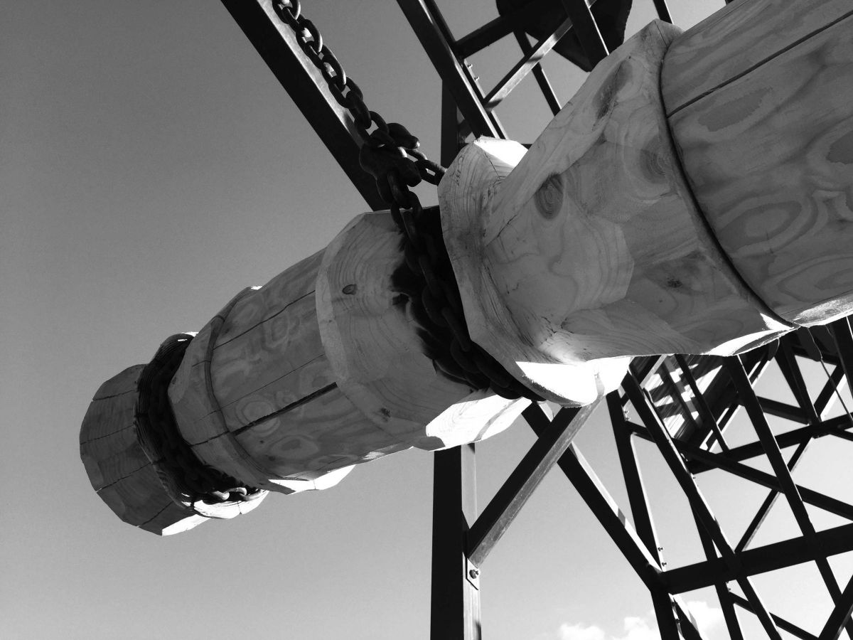 Cependant, si cette sculpture reste, comme les autres œuvres de John Cornu, sobre, voire énigmatique, référencée mais peu bavarde, c’est le choix de présentation de Butoir qui surprend. Produite pour intégrer le parc de sculptures de 40mcube, le HubHug Sculpture Project, et plus spécifiquement pour être présentée sur Le Rack, dispositif de présentation d’œuvres dans l’espace public s’apparentant à un rack de stockage géant, Butoir est présentée de manière frontale et suspendue par des chaînes. Prête à défoncer, en somme. Si John Cornu reprend régulièrement des formes sobrement menaçantes, noires, pointues, en équilibre précaire, Butoir est clairement plus violente. Cette sculpture au titre imagé renvoie à cet autre objet qu’est le bélier, utilisé depuis l’Antiquité pour enfoncer des portes ou des murs. À la position d’attaque face à la personne qui regarde l’œuvre s’ajoute des éléments suggérant une agressivité inhabituelle, des chaînes métalliques grossières, archaïques, qui contrastent avec la douceur du bois lissé. Un mobile à la lourdeur évidente, empêché dans son mouvement, contraint, contenu, retenu, un butoir bloqué, une sculpture dominée.