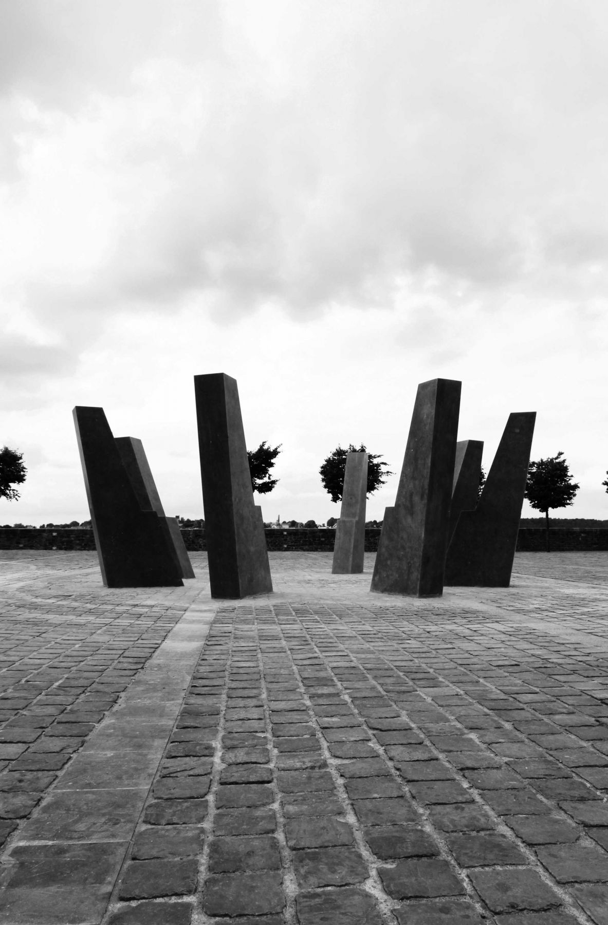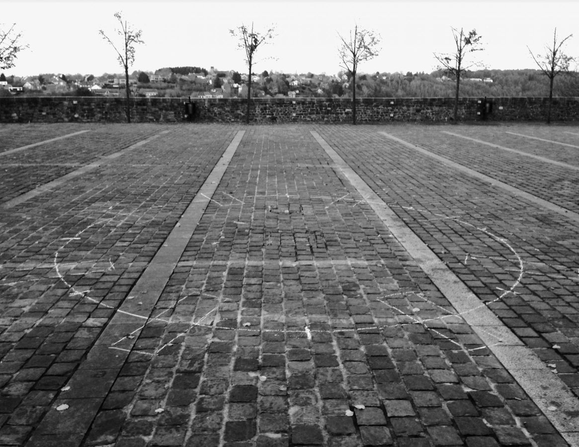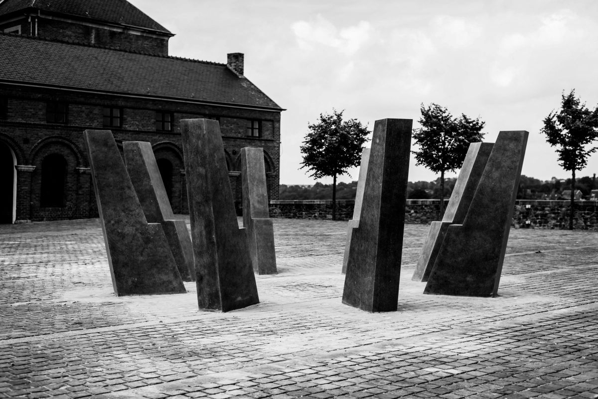 Installés en cercle au pied du Beffroi de Thuin, ces monolithes en pierre bleue du Hainaut créent un dispositif panoptique rayonnant et traversant. La forme de chacun des 8 blocs est empruntée à celle de contreforts romans. Ici renversés, ces éléments architecturaux n’apportent aucun soutien à aucun édifice. De l’ordre de la métonymie (le fragment pour le tout), « Comme un gant » propose un retournement, une inversion des forces (centrifuge vs centripète), tout en convoquant l’idée d’une protection rapprochée.