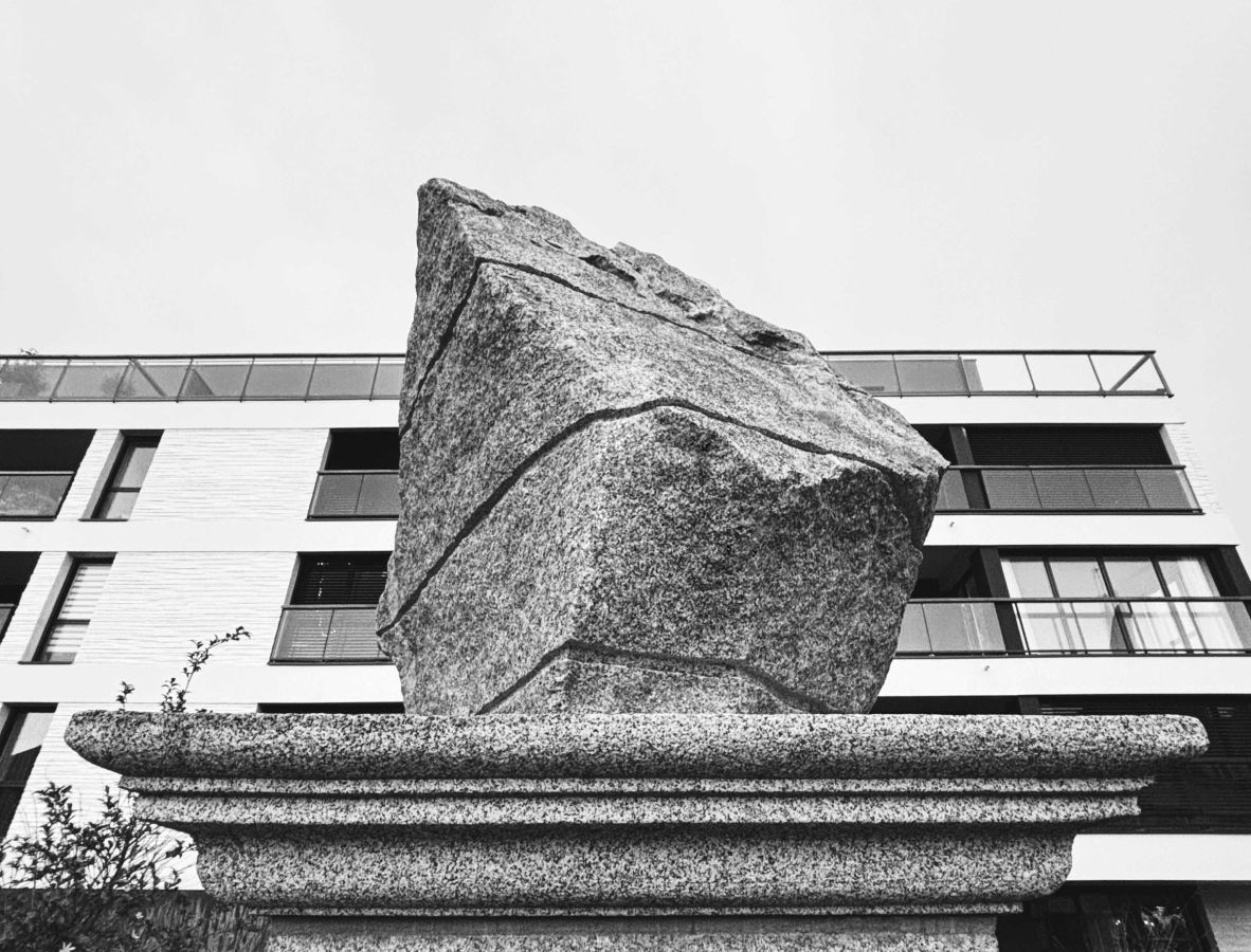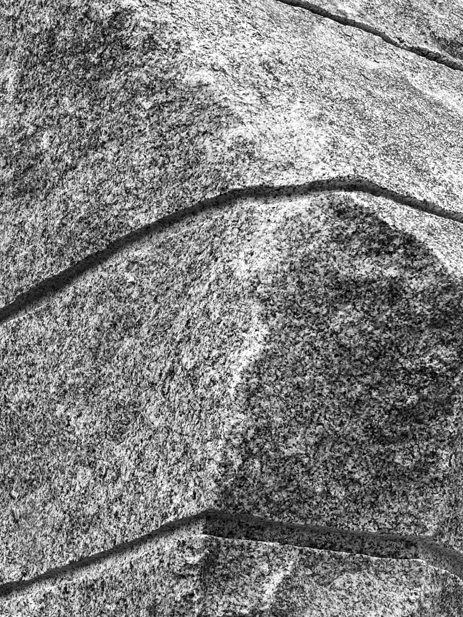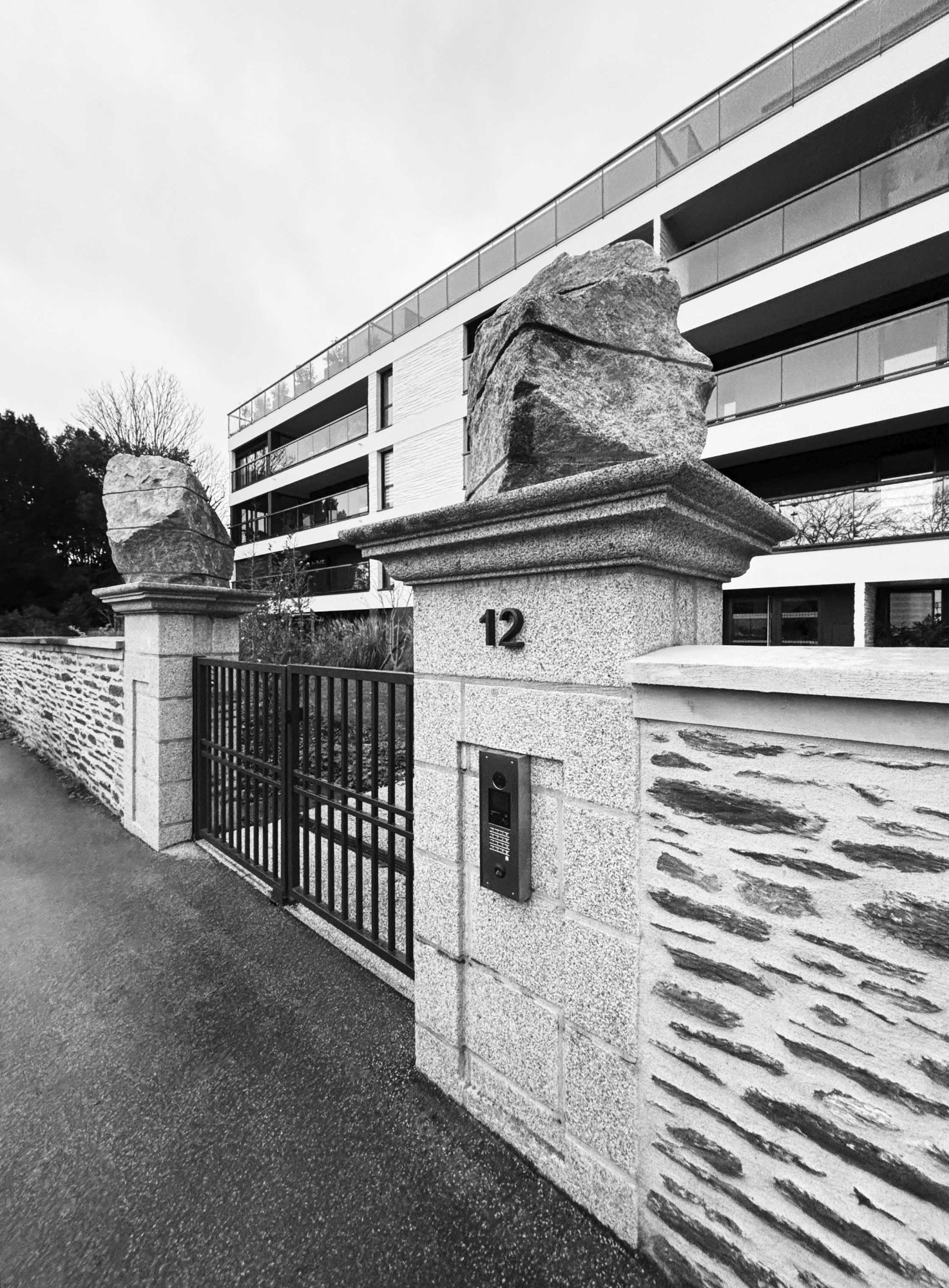 « D’une pierre deux coups » est un travail in situ de sculpture mené sur deux blocs de granit gris brut provenant de la carrière de Languédias. La taille directe opérée dans les blocs se réfère aux rainures du joint béton présent sur les piliers marquant l’entrée du 12 avenue Joseph Jan à Bruz. Les sillons ont été gravés sur les blocs en suivant un rythme similaire à celui observable sur les deux piliers.