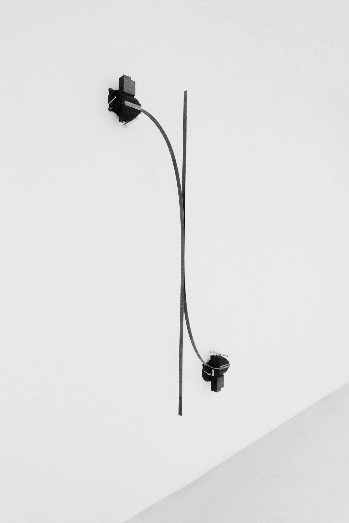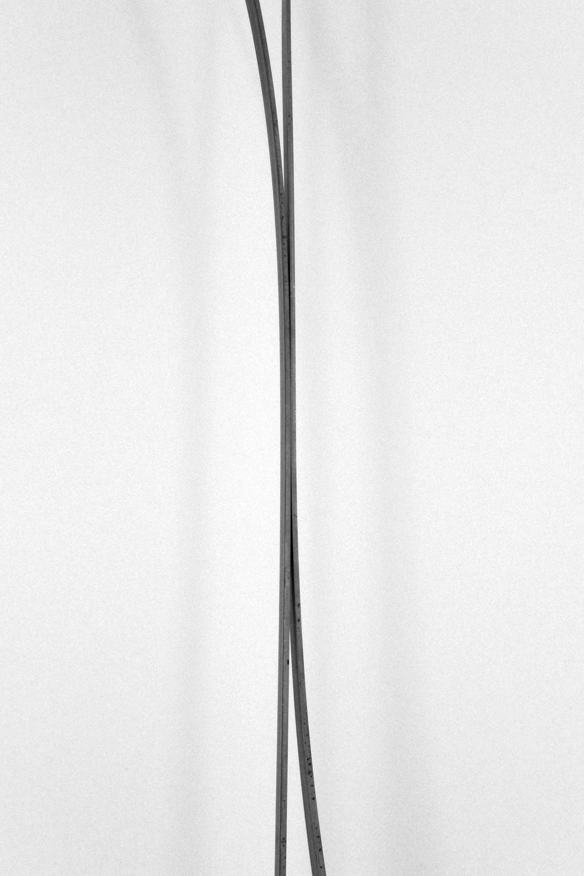 Prisonniers de mâchoires métalliques, deux profilés d’acier ne trouvent leur point de jonction qu’au prix d’une contrainte sur leur ressort rectiligne. La géométrie euclidienne qui les voudrait parallèles à l’infini se barre d’un rapport de forces physiques : leur accouplement se fait sous pression.