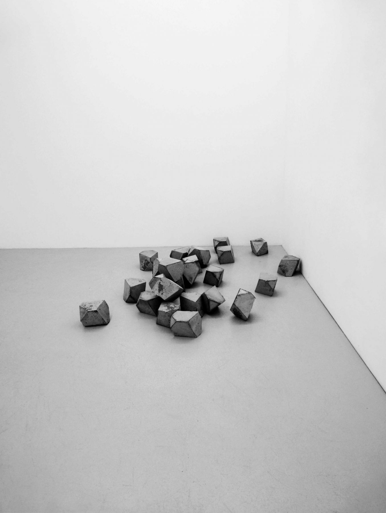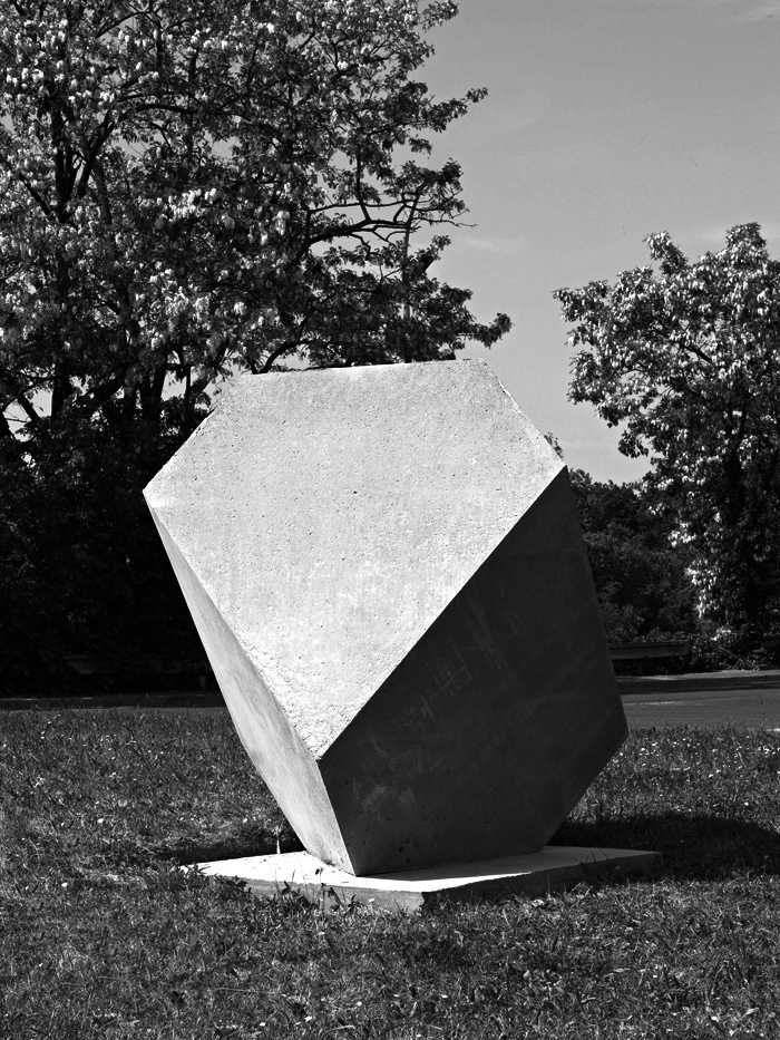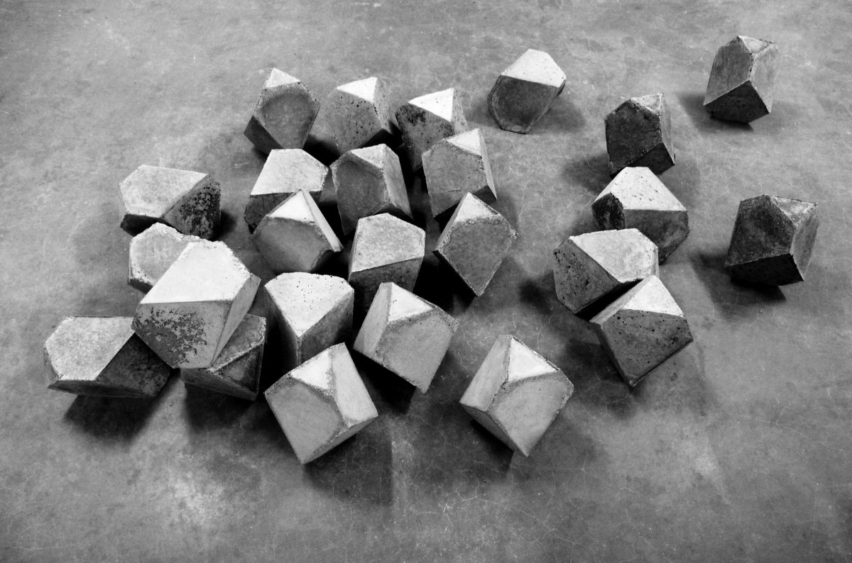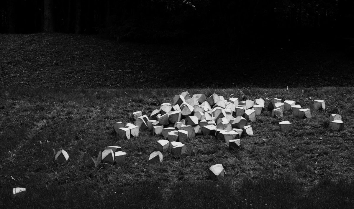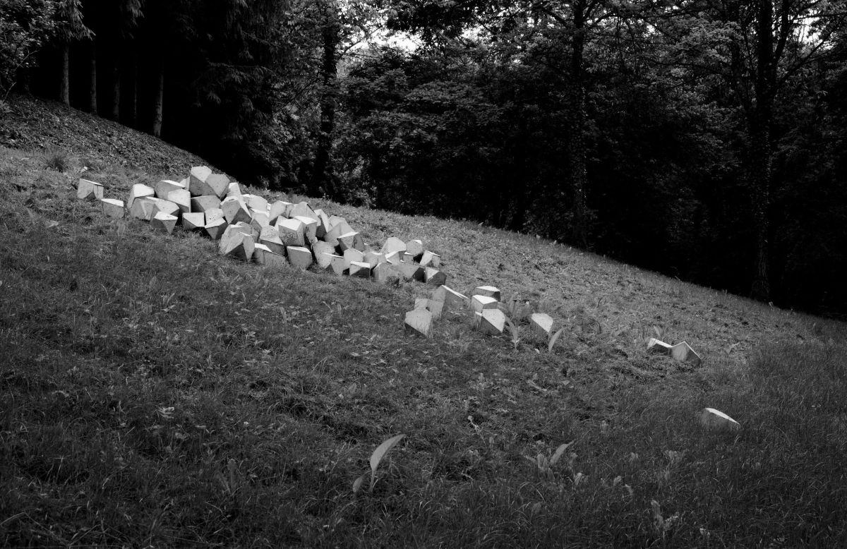 De loin, on songe à la ruine d’un monument antique ; ou bien à un ossuaire de catacombe, à un amoncellement de crânes. L’œuvre est en fait constituée de 150 polyèdres identiques, répliques en béton—et en trois dimensions—de ce solide à huit faces scruté du coin de l’œil par l’ange inquiet dans Melencolia I (1514), célèbre gravure d’Albrecht Dürer. L’analogie entre le crâne et le polyèdre est de nature métaphysique car tous deux sont objets de méditation. Hamlet s’absorbe dans la contemplation du crâne de Yorick comme l’ange de Dürer observe la pierre taillée. Et ils en tirent sans doute des réflexions similaires sur la douloureuse et mortelle condition humaine.