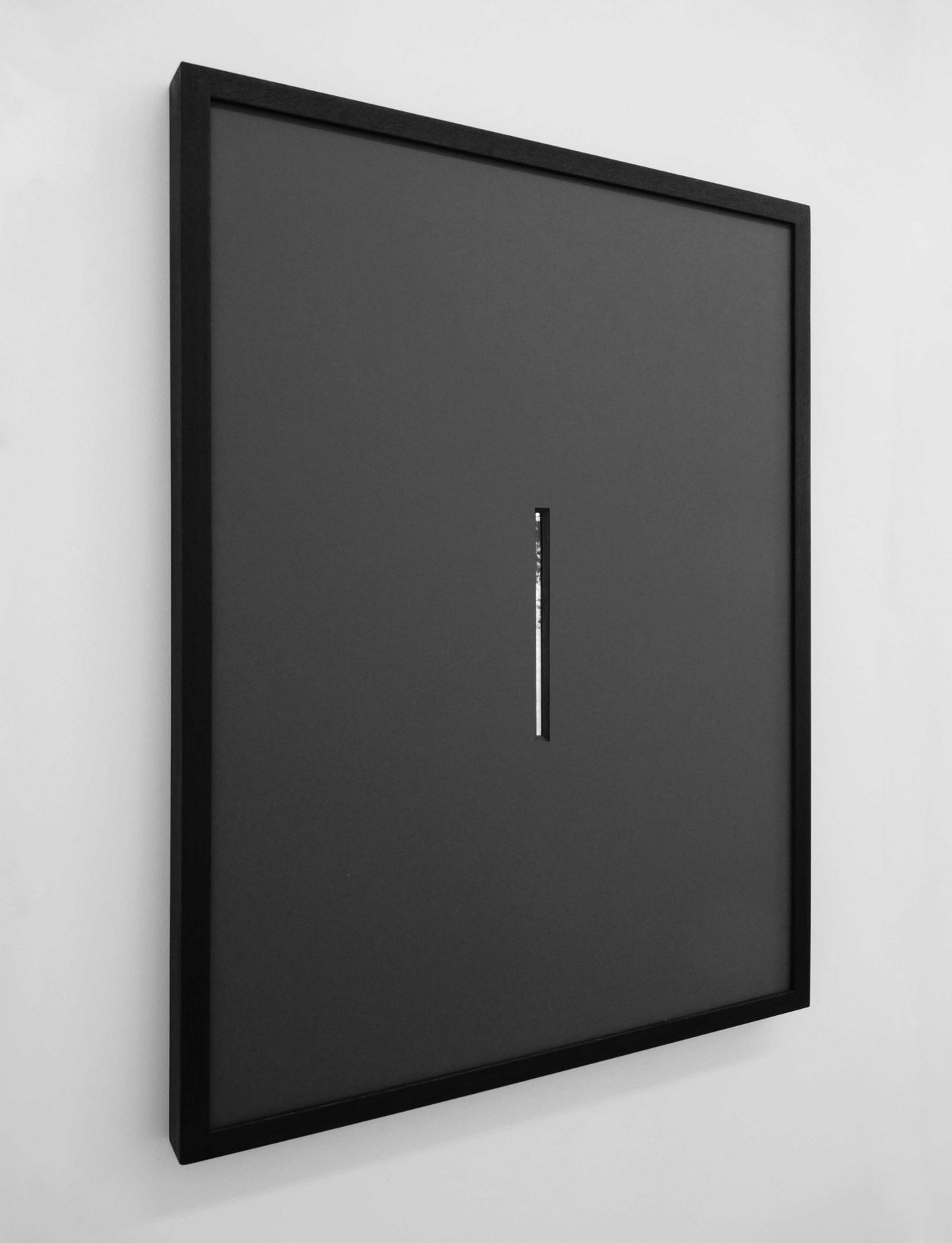 Par la meurtrière relève du même simulacre. Accroché au mur, un cadre de bois foncé est muni d’une marie-louise épaisse, de couleur gris anthracite, entaillée en son centre. La fente, verticale, étroite, évoque une fêlure intime jusqu’au moment où elle laisse apparaître un miroir. Peu avenant — il évoque une ouverture par laquelle on peut tuer — le titre de l’œuvre incite à épier. Mais, par la meurtrière, rien n’est accessible excepté le reflet, à la fois image et sujet, de l’observateur·rice devenu·e l’observé·e, devenu·e son·sa propre ennemi·e. Le principe de visibilité est donc inversé. Celui ou celle qui devrait être protégé·e se trouve à découvert, vacillant·e, contraint·e de redéfinir sa position.