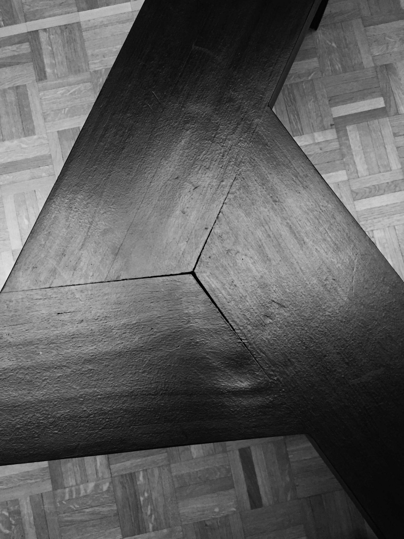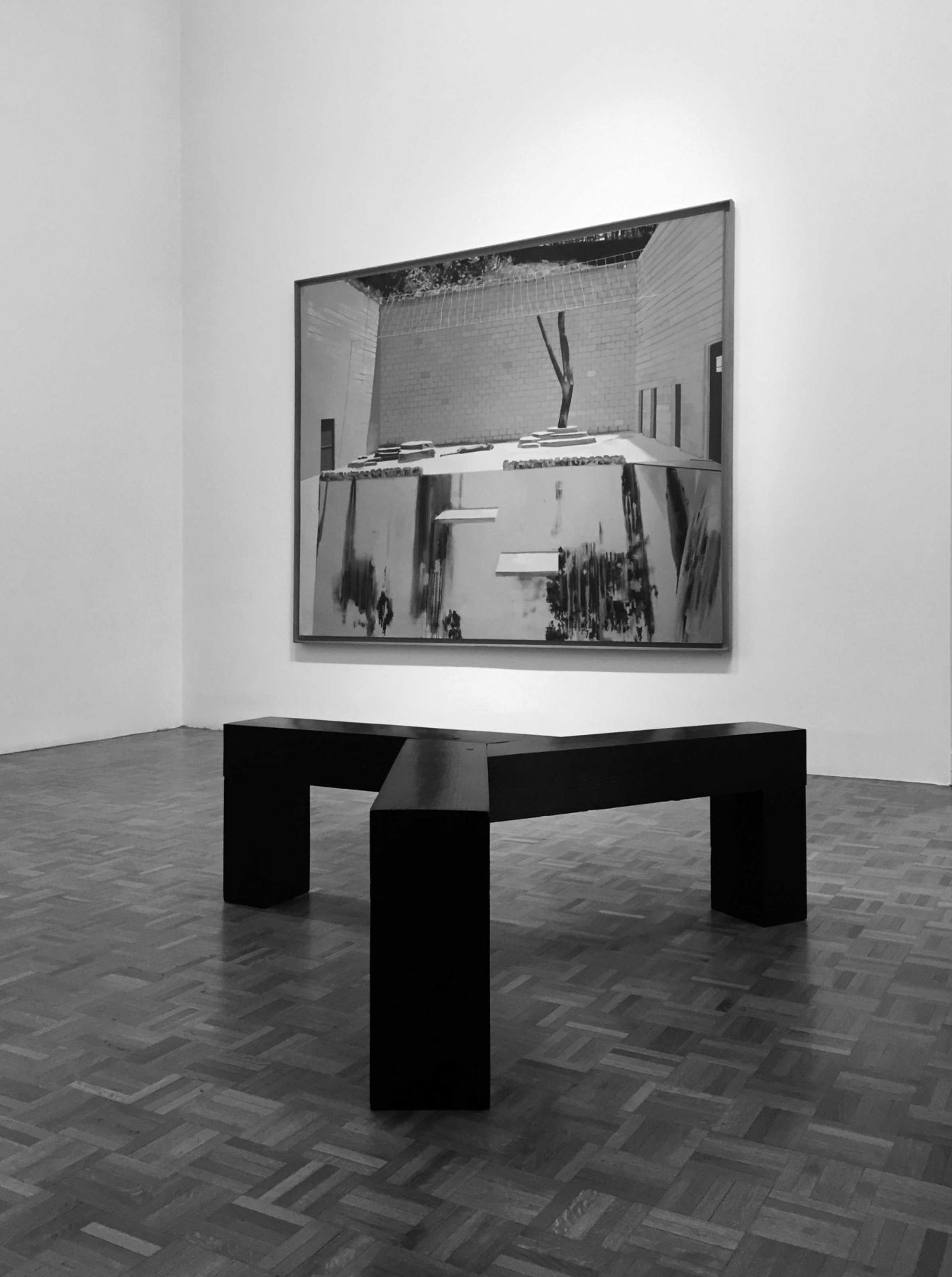 « Sans Titre (Fleury-Mérogis) » se compose de cinq éléments de formes géométriques simples en bois teinté de noir, fabriqués de manière artisanale par l’artiste. La forme « tripale » de chaque banc ainsi que le dessin hexagonal de l’ensemble, reprend le plan des bâtiments de la prison de Fleury-Mérogis. Ces éléments associent à la fonction purement spéculative de la sculpture, celle utilitaire de bancs et conjuguent la référence à l’art minimal à une dimension narrative. Cette œuvre joue ainsi sur les associations d’idées qui jaillissent autour de l’objet du banc (du banc des accusés aux bancs publics), et de la sculpture, qui évoque le positionnement du corps dans l’espace, de l’espace public à l’espace carcéral. Comme dans d’autres de ses œuvres, la source d’inspiration de l’artiste est l’architecture moderniste, ici celle de la prison de Fleuy-Mérogis. Construite en 1968 et considérée à l’époque comme “modèle”, elle est devenue, au fil des ans, une prison surpeuplée et dégradée.