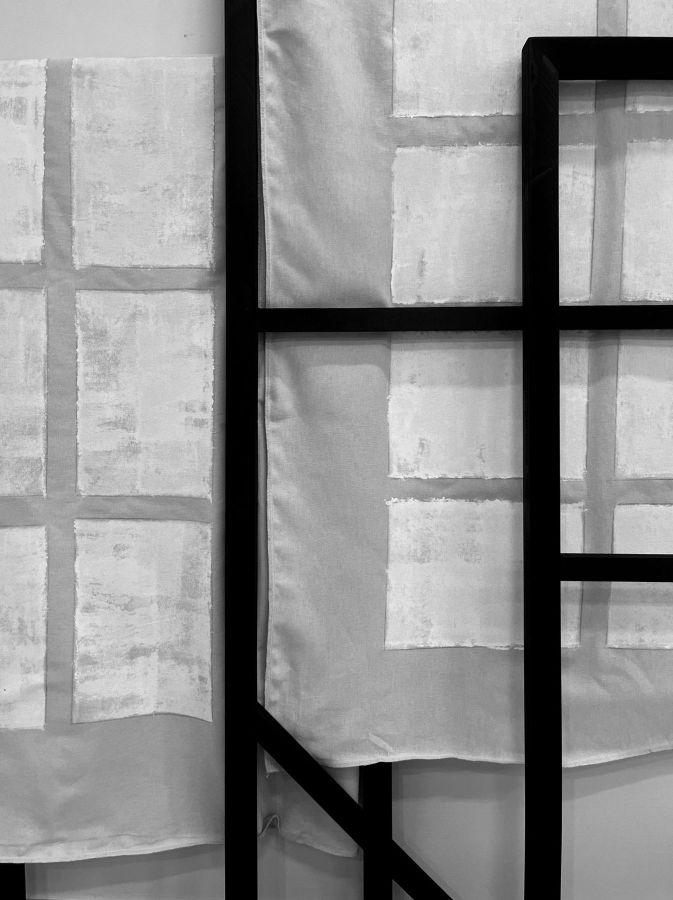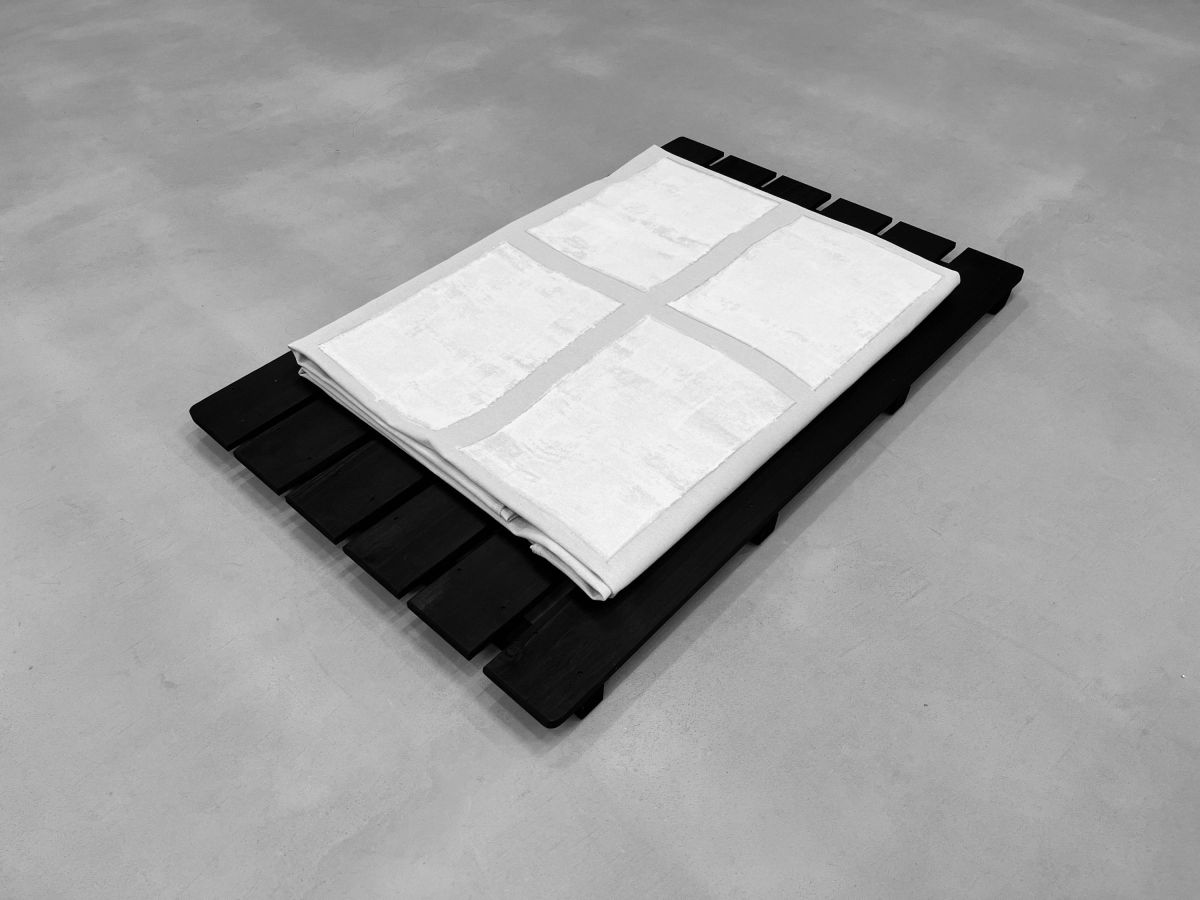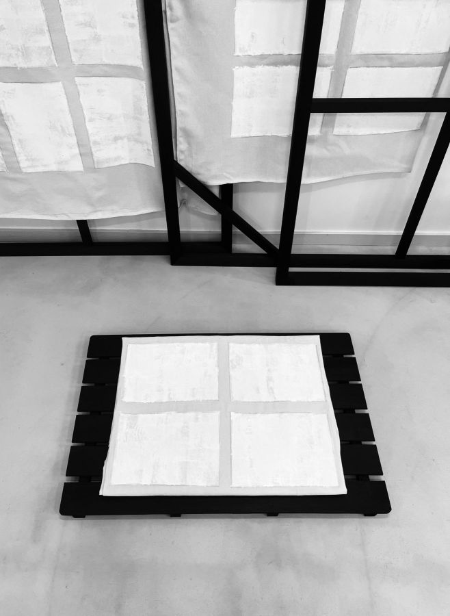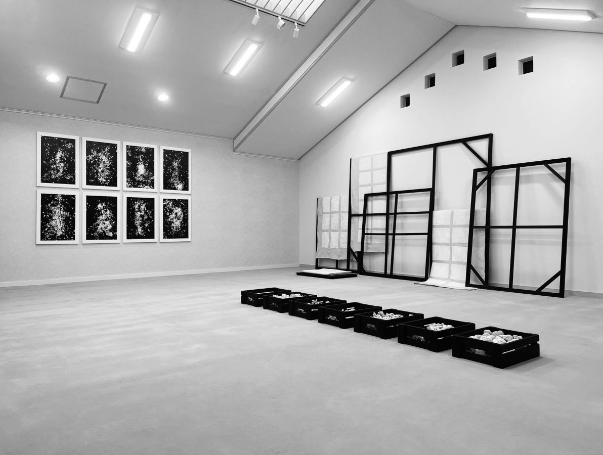 2022 Châssis, palette, encre de Chine, toiles, crayon de papier, acrylique blanche Dimensions variables Vues de l'exposition Still lifes, Nanjo Art Museum, Okinawa, Japon, 2022
