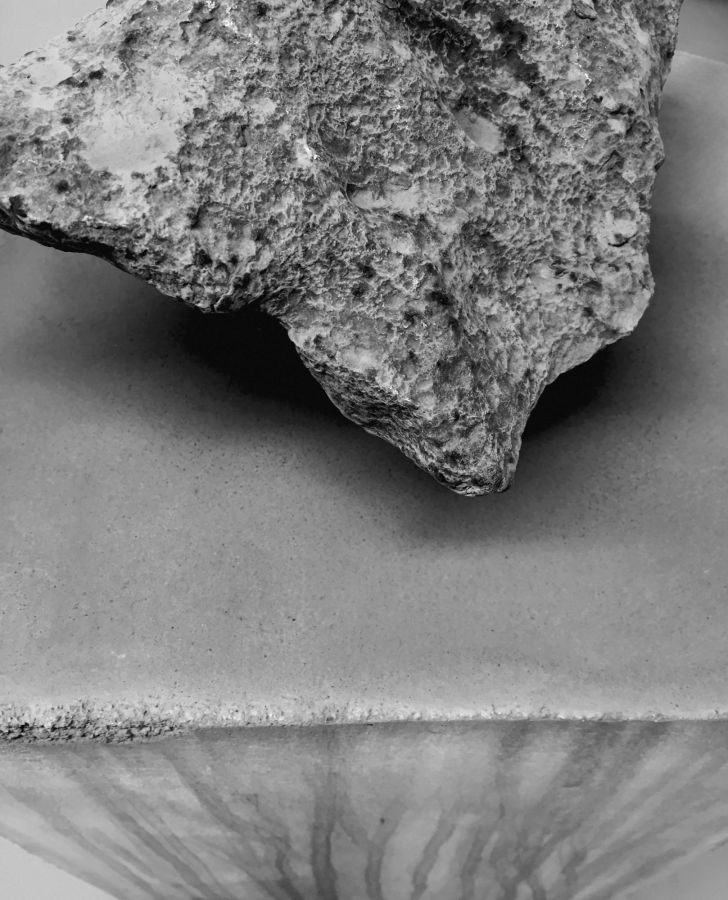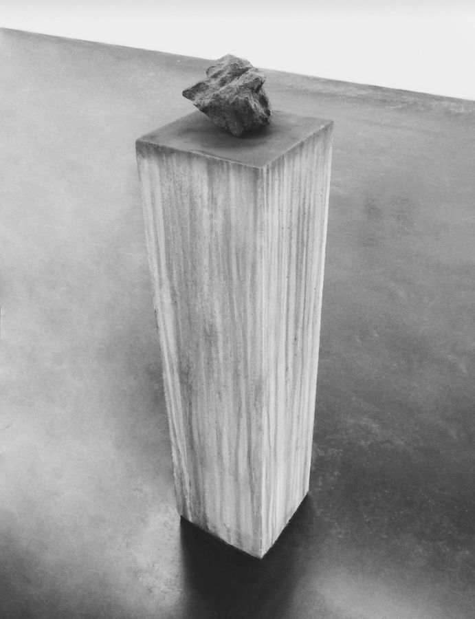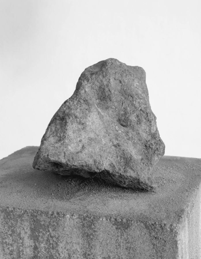 Cette réflexion de John Cornu apparait fort à propos à la découverte de son Vol de nuit. Une pierre aux formes heurtées et à la texture grenue, plus grosse que mon poing fermé, a été posée par l’artiste sur un socle haut, une forme rectangulaire simple, en béton. La suite est l’œuvre du temps, de son passage comme de ses variations. Deux années laissée à l’air libre dans le jardin, et la roche a dégorgé de longues coulées ocres sur son piédestal anthracite ; de languissants drippings produits par l’oxydation des particules ferreuses qui la composent. Acquise en ligne, la pierre est météoritique et provient de la fragmentation de l’une des plus grosses météorites à avoir frappé la surface de la Terre, il y a quelques milliers d’années. La zone d’impact, baptisée Campo del Cielo, est située en Argentine : soit le territoire même de Vol de nuit, une épopée d’Antoine de Saint-Exupéry publiée en 1931. Au fil des pages, la destinée tragique de deux pionniers de l’air, le pilote Fabien et son radio, se dessine. « Si j’étais très juste, un vol de nuit serait chaque fois une chance de mort »2
