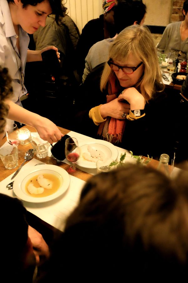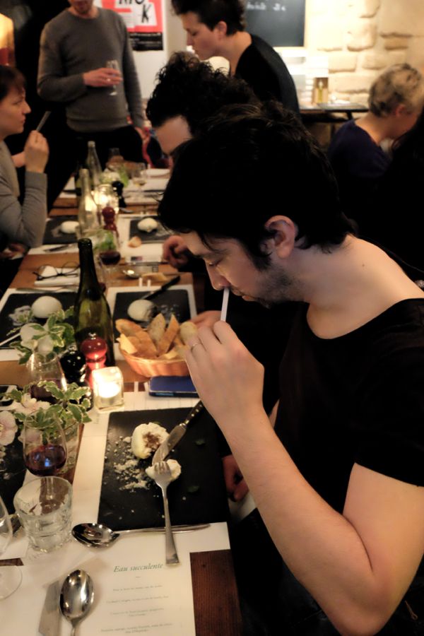 Eau succulente est un projet de collaboration entre la chef Virginie Galan et la commissaire et mixologue Géraldine Geffriaud et moi-même. Pour ce repas au Café B nous avons travaillé à délocaliser le goût dans le nez. L’odorat devient le moyen d’accommoder les plats. Chaque plat est accompagné d’un parfum qui agit comme un condiment.