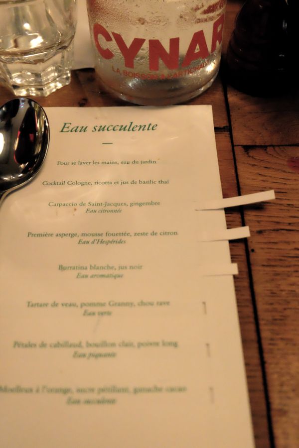 Eau succulente propose de revisiter la traditionnelle « eau de cologne » qui à l’origine avait un usage autant gustatif, médicinal que cosmétique. Le menu a été conçue en 8 expériences du lavage de mains à l’eau du jardin au cocktail cologne pour se parfumer l’intérieur et 6 plats chacun accompagnés d’un parfum. Les expériences culinaires et olfactives ont été concues en crescendo de manière à rendre visible la stucture du parfum final : eau succulente