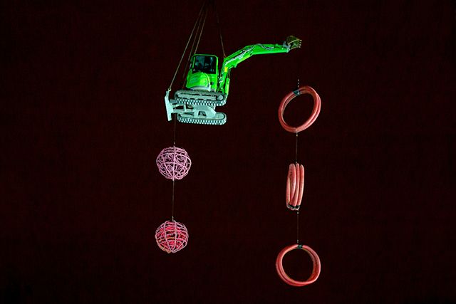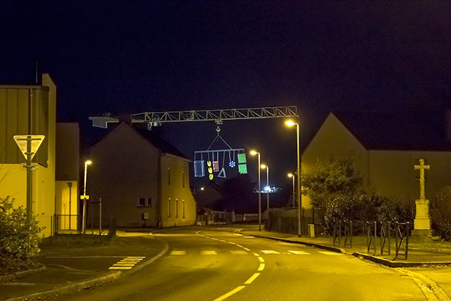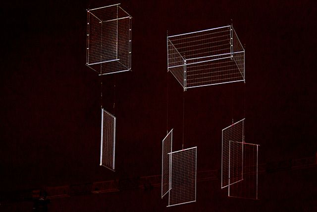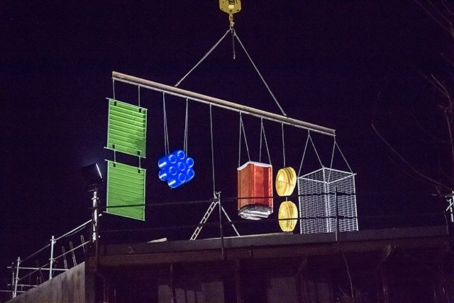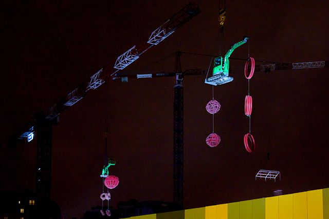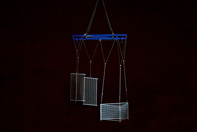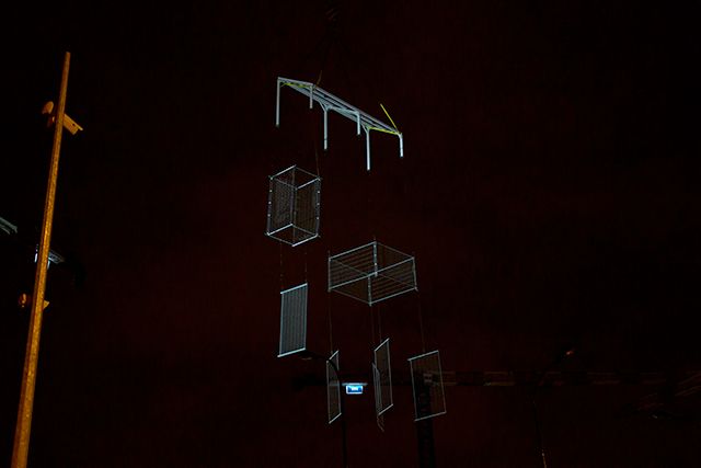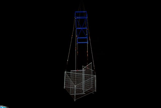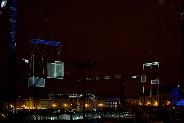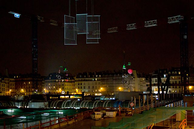 Des structures à étages sont suspendues dans le vide aux flèches des quatre grues du Chantier des Halles. Composées d’éléments prélevés sur le chantier en contre-bas et éclairées en contre-plongée, elles oscillent lentement sous leur poids dans la nuit.
