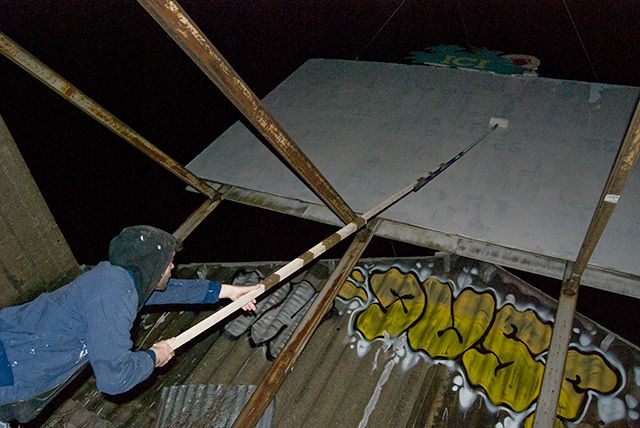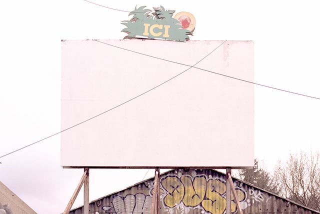 Panneau publicitaire, peinture acrylique, rouleau, phares de voitures.