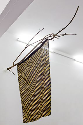 « Les sacs plastiques abandonnés qui se prennent dans des arbres, des grilles ou autres obstacles, sont en quelques sortes le drapeau des espaces en friche. En écho à ces signes accidentels, Bag Flag propose un véritable drapeau dont le motif est l’un de ceux qui sont fréquemment reproduits sur les sacs plastiques non griffés. Picturalement, Bag Flag est de plus une abstraction ready-made, ce qui mène à la question suivante : l’abstraction peut-elle exister à l’heure ou toute forme a priori abstraite peut en réalité se lire comme la figuration d’un signe abstrait préexistant, qu’il appartiennent à l’histoire de l’art où ait été digéré par l’industrie, la publicité ou la communication visuelle ? »
