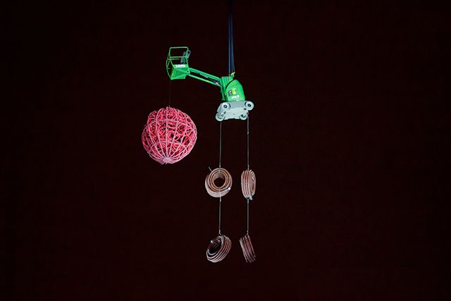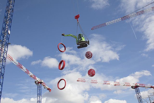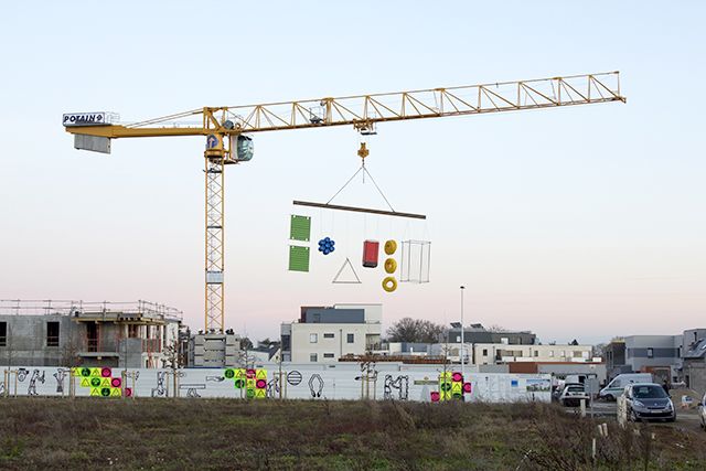 Calderpillar est un mobile urbain et monumental à mi-chemin entre une sculpture de Alexander Calder et une miniature de chambre d’enfant et dont les figures géométriques et colorées sont remplacées par des formes massives et industrielles. Une structure à étages composée d’éléments prélevés sur le chantier en contre-bas est suspendue à la flèche d’une grue de la ZAC Renaudais et oscille lentement dans le vide.