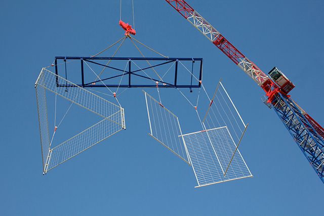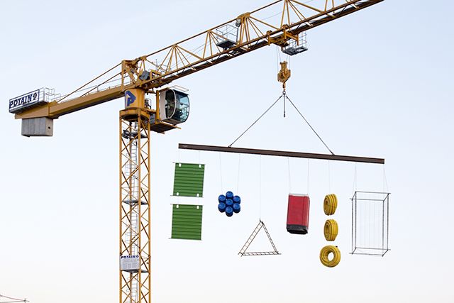 Grues à tour, palonnier, mini-pelle, nacelle, armature métallique, clôtures de chantier, gaines PVC, câbles