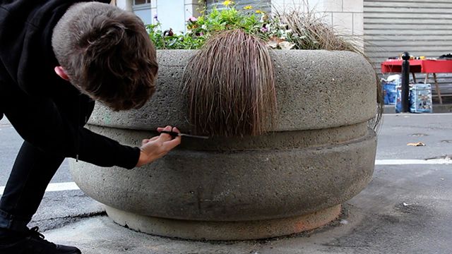 « Lors d’une marche de repérage, nous avions remarqué un socle vide dans le parc du Musée d’art contemporain et avions préparé une action : nous espérions tenir en station une sculpture vivante de statue de bronze emballée pendant au moins une heure.