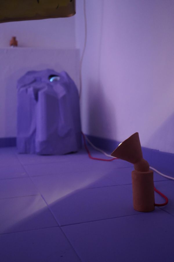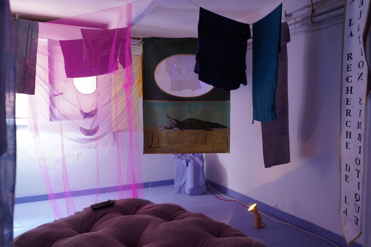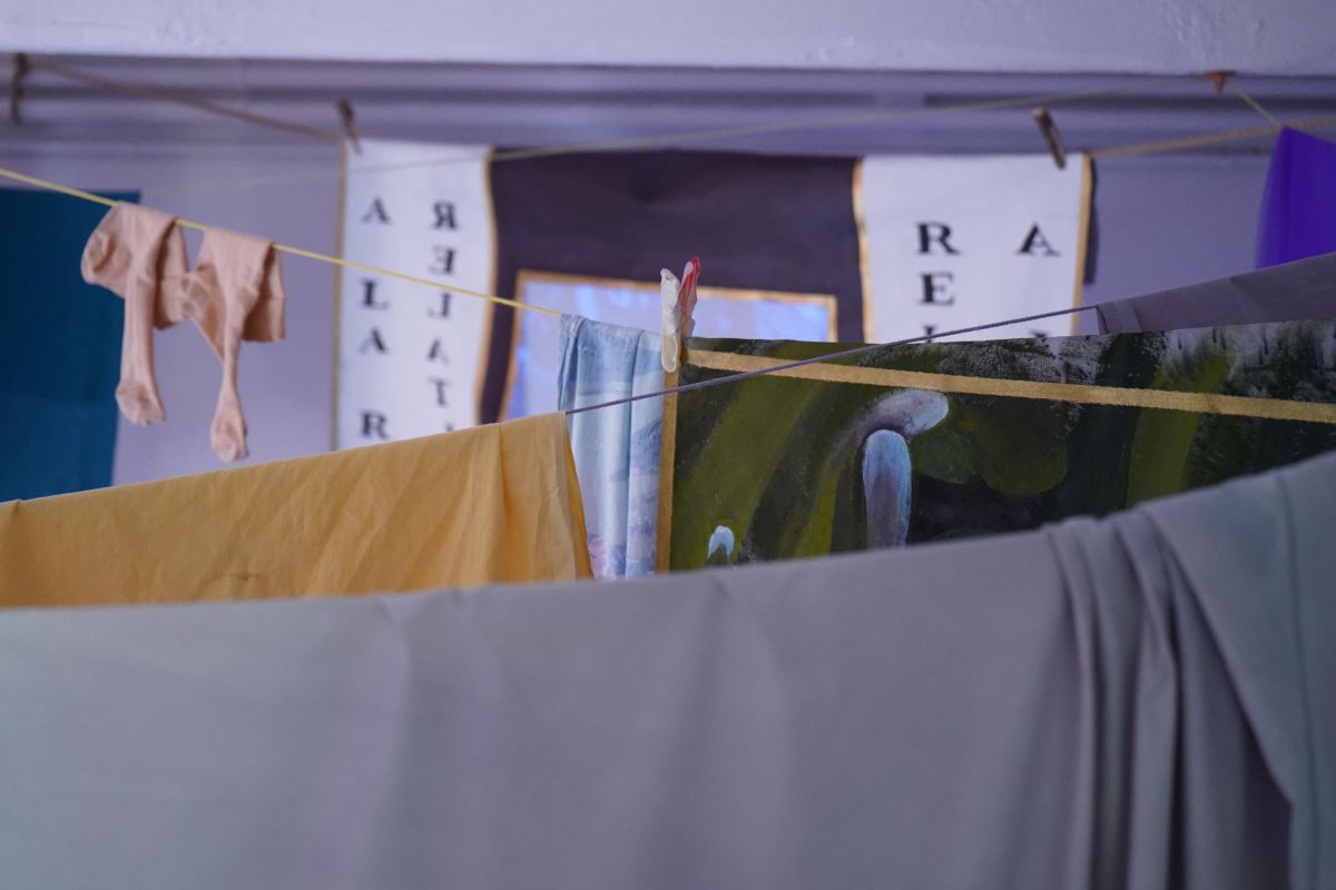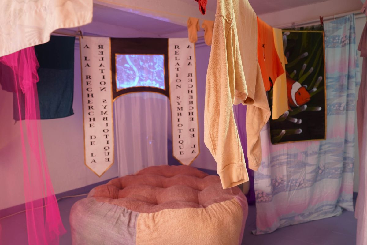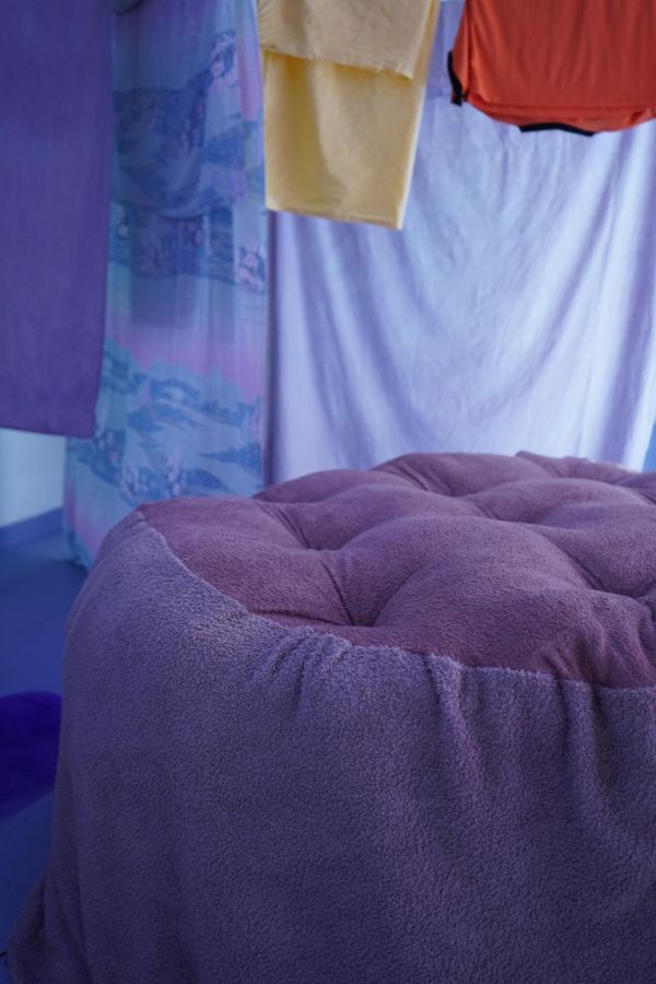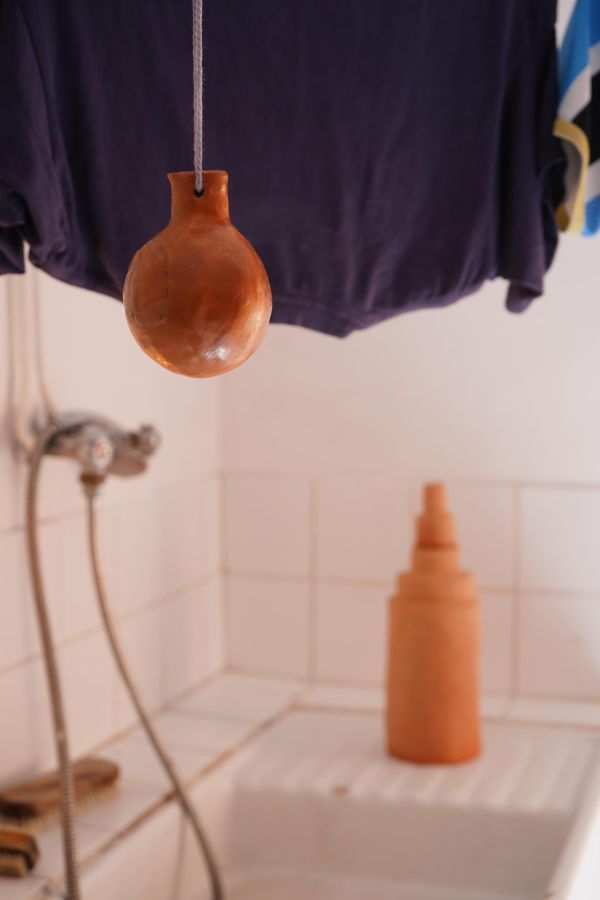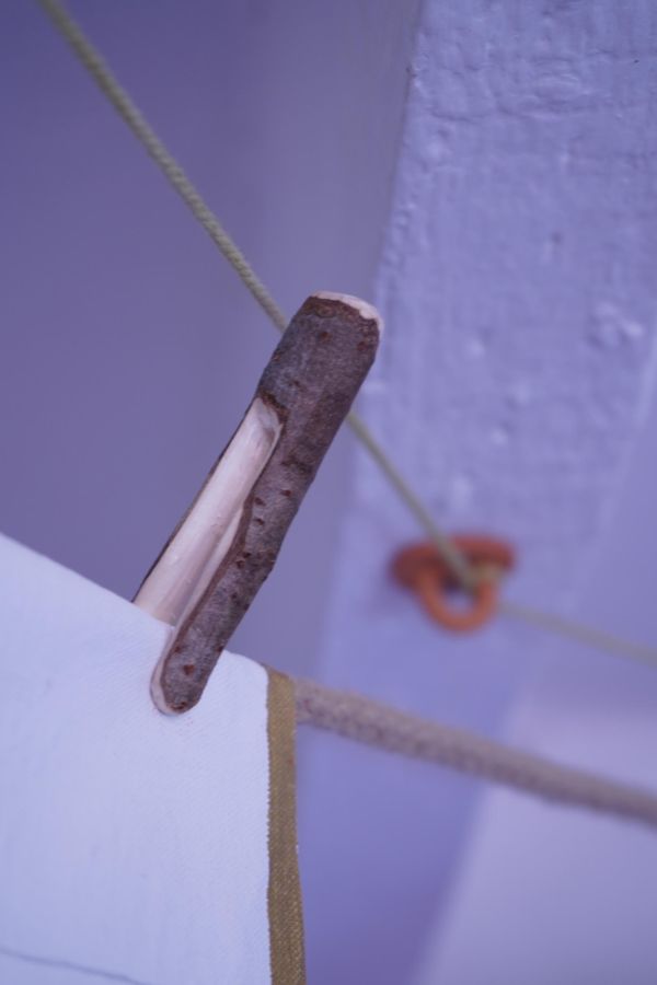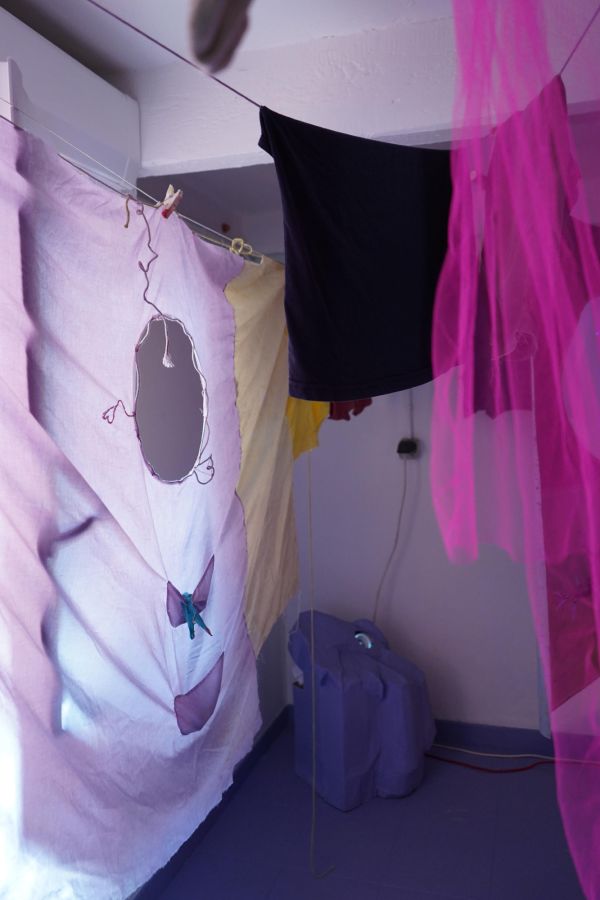 Au centre de la salle trône la méridienne d’éponge imbibée de vin que nous avons façonnée sur place avec Alisson Schmitt. Autou, les vidéos dansantes de Lucas Tortolano sont projetées depuis mes rochers sur les peintures-écrans d’Alisson. J’ai teints des fils avec du figuier, du curcuma et du chou pour accueillir le linge, et taillé des pinces dans des branches de peupliers. Assis.e sur la méridienne on entend des Bb Brunes distordus et des histoires d’amour qui n’ont pas durées; c’est la pièce sonore d’Alisson et de Lucas. Un peu plus loin il y a un livre pastiche et une vidéo conté d’Alisson puis mes lampes, les pinces mutantes et les tulles de Lucas, la bouteille de lessive et sa gourde adoucissante que j’ai modelées et cuit à la Guerrière, le lieu d’exposition. Dans cet espace mi galerie mi buanderie, la machine à laver qui y loge au lieu d’être contrainte est devenu sujet.