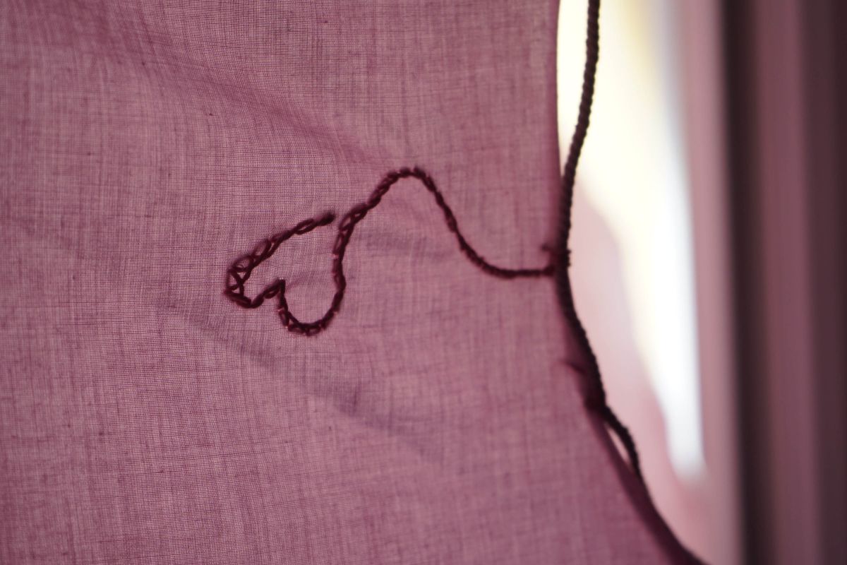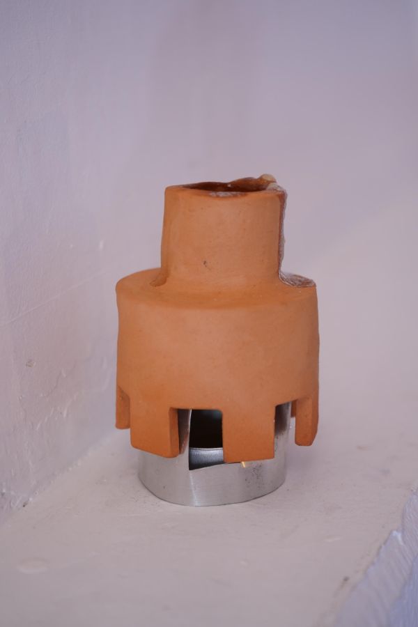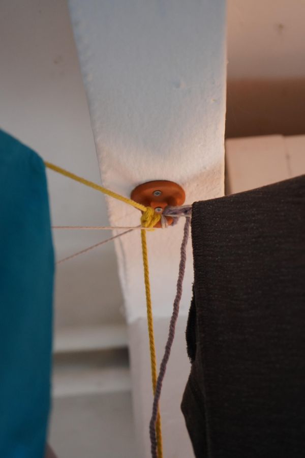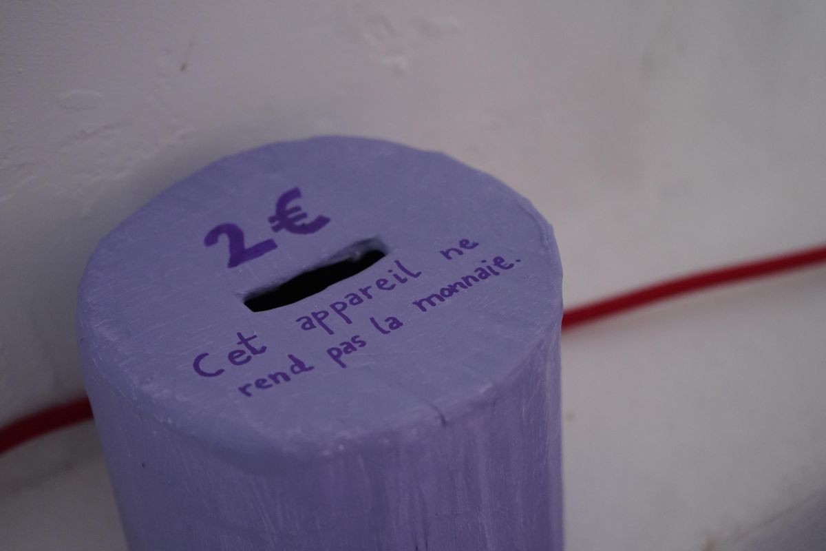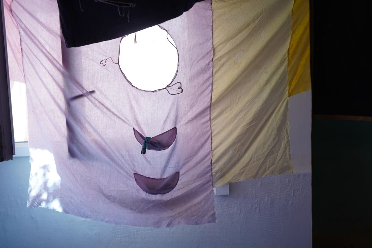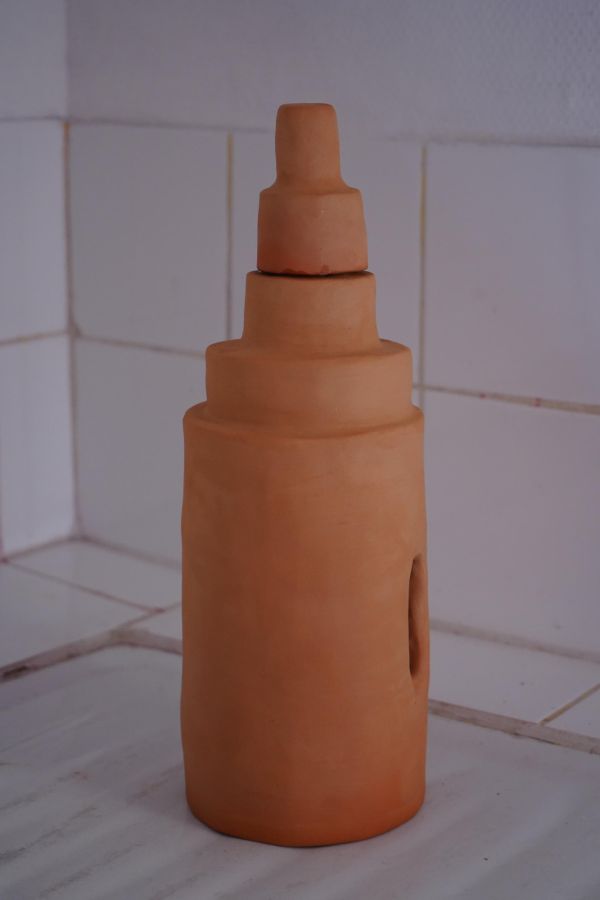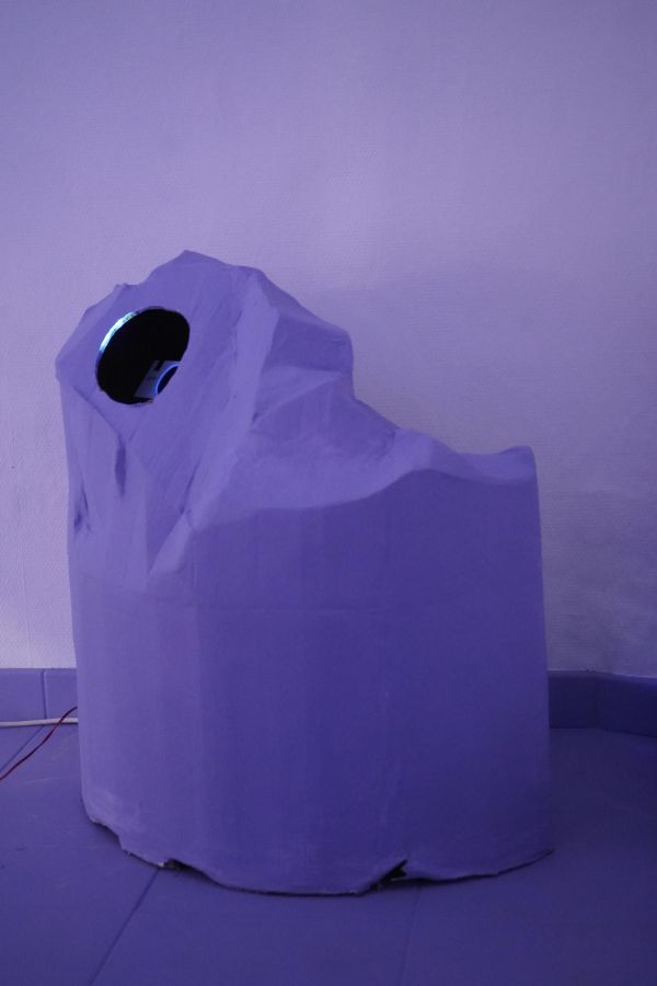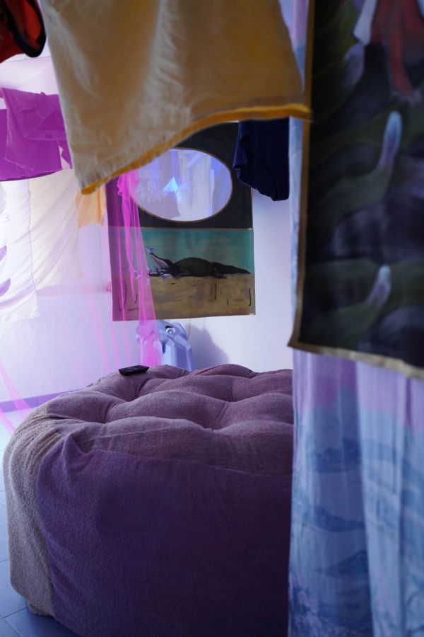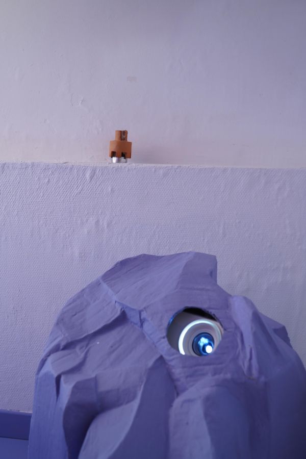 Au centre de la salle trône la méridienne d’éponge imbibée de vin que nous avons façonnée sur place avec Alisson Schmitt. Autou, les vidéos dansantes de Lucas Tortolano sont projetées depuis mes rochers sur les peintures-écrans d’Alisson. J’ai teints des fils avec du figuier, du curcuma et du chou pour accueillir le linge, et taillé des pinces dans des branches de peupliers. Assis.e sur la méridienne on entend des Bb Brunes distordus et des histoires d’amour qui n’ont pas durées; c’est la pièce sonore d’Alisson et de Lucas. Un peu plus loin il y a un livre pastiche et une vidéo conté d’Alisson puis mes lampes, les pinces mutantes et les tulles de Lucas, la bouteille de lessive et sa gourde adoucissante que j’ai modelées et cuit à la Guerrière, le lieu d’exposition. Dans cet espace mi galerie mi buanderie, la machine à laver qui y loge au lieu d’être contrainte est devenu sujet.
