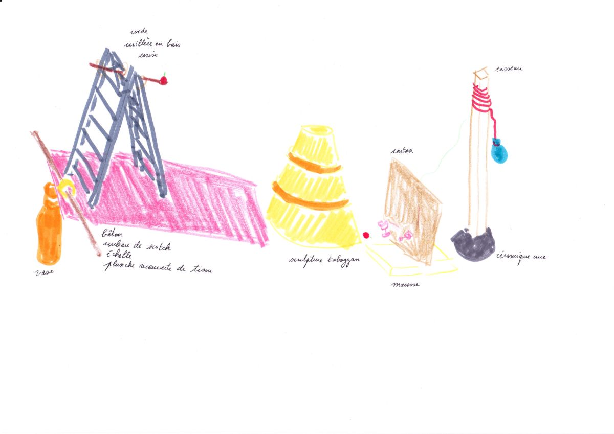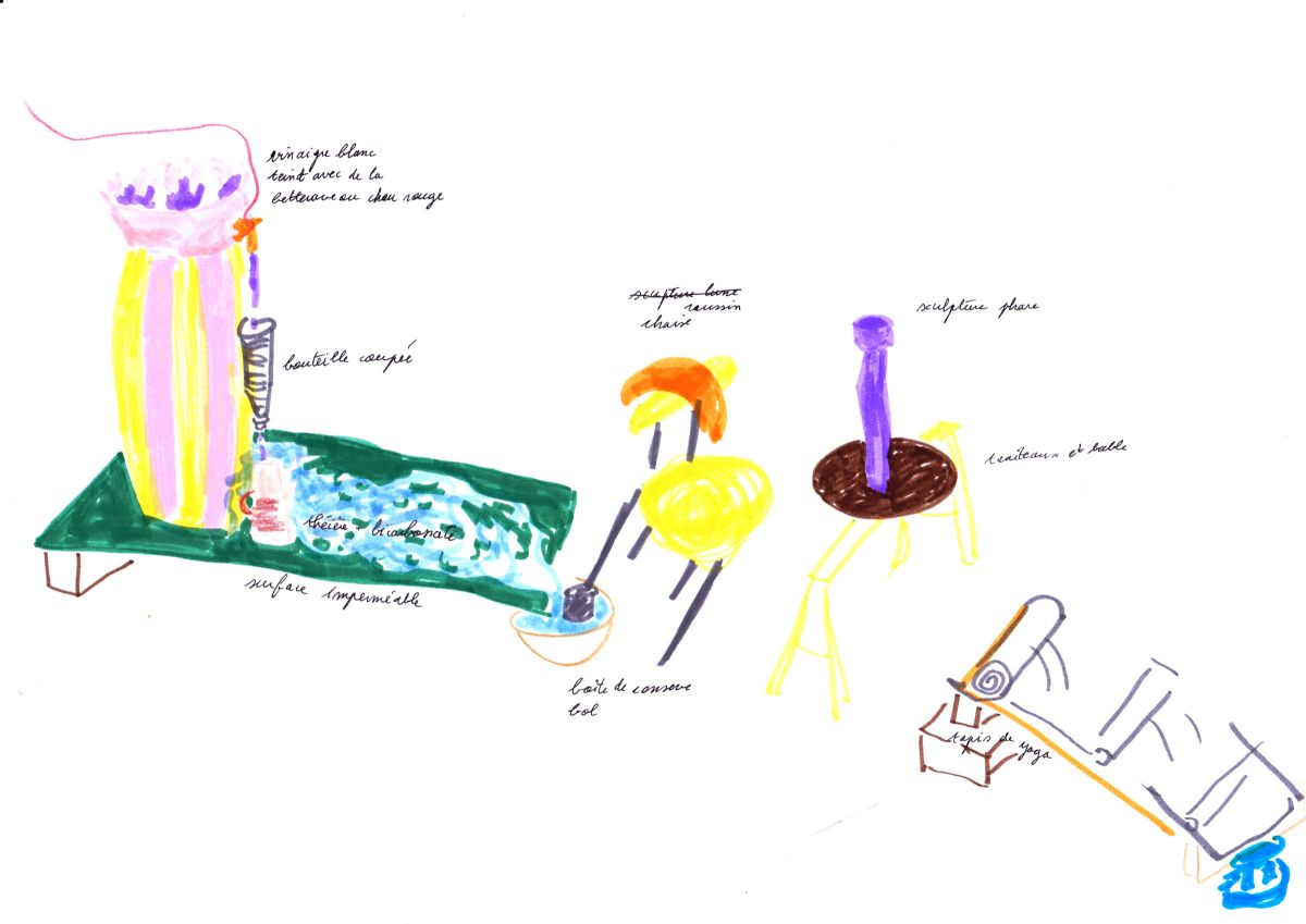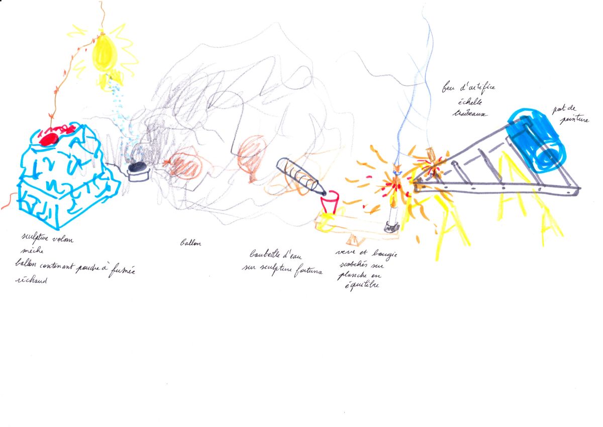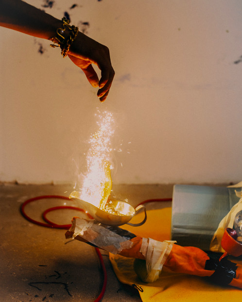 Pour ce shooting j’ai pensé un décor dans l’atelier Fiasco à Montreuil. Entre le vacarme de sculptures, d’outils, les fumées colorées, étincelles et autres mousses dégoulinantes, les vêtements et accessoires se greffent et ne font qu’un dans ce parcours rappelant The way things go de Fischli and Weiss.