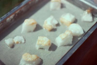 Pour clore le projet de Clara Levieuge, artiste en résidence en crèche porté par le centre d’art contemporain, celle-ci m’invite à sensibiliser les tous petits aux coutumes des Luniens. Lors d’un banquet texturé/déguisé nous avons mis à disposition des denrées rappelant la Lune et sa bi-coloritée. L’idée était de surprendre les enfants avec les textures, les odeurs et les formats, un mobilier adapté à leur taille leur a permis de se sentir libre de toucher, gouter et sentir ce qui été proposé.