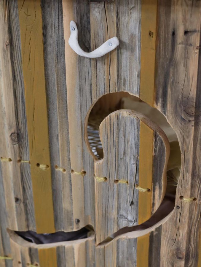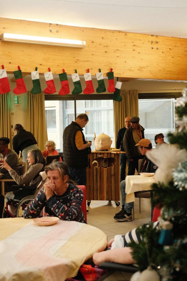 Suite à plusieurs visites avec les équipes et les habitant·es du centre, j’ai pensé une installation pérenne pour cette espace de vie, de travail, de passage.
