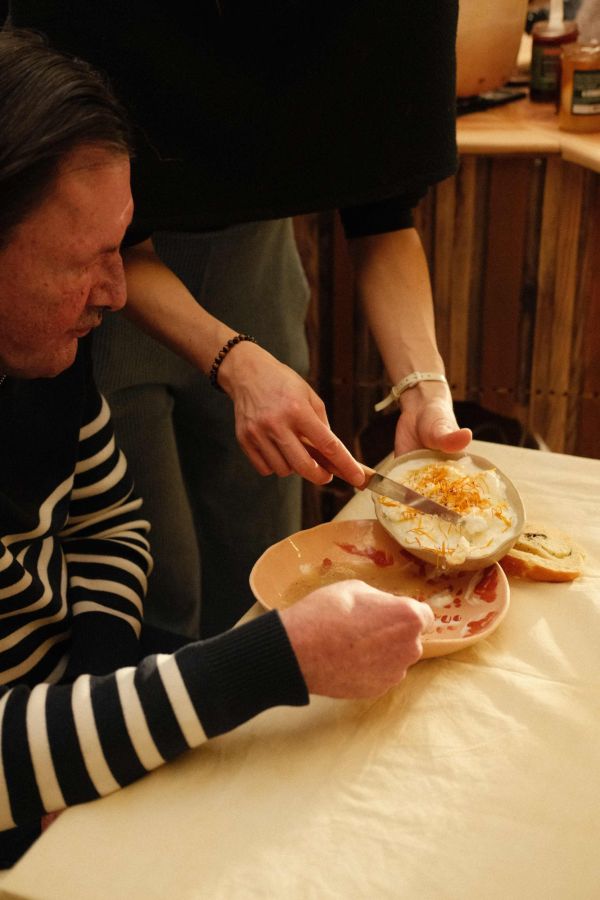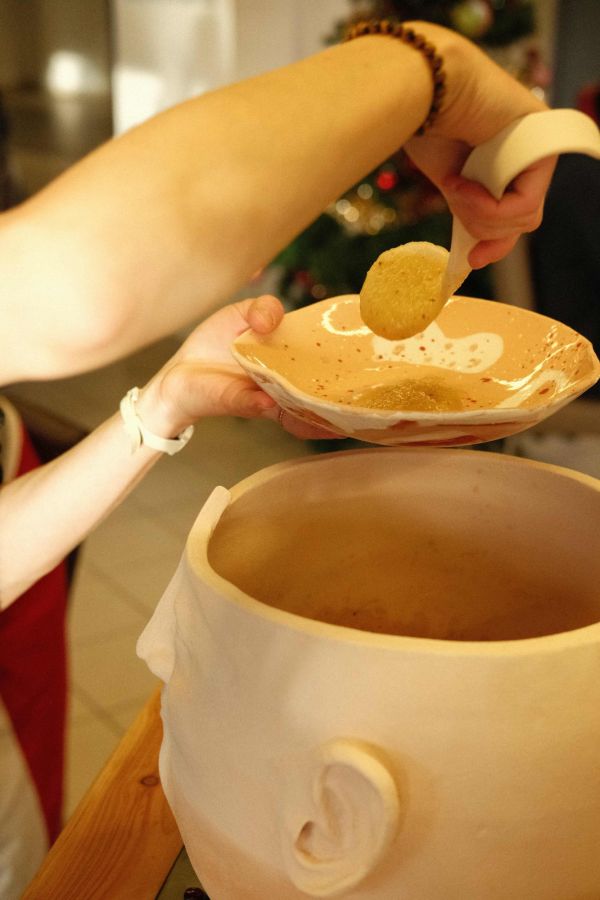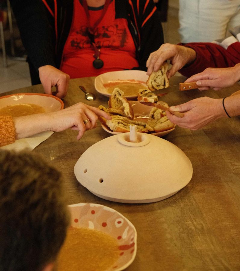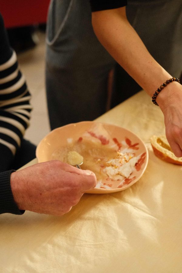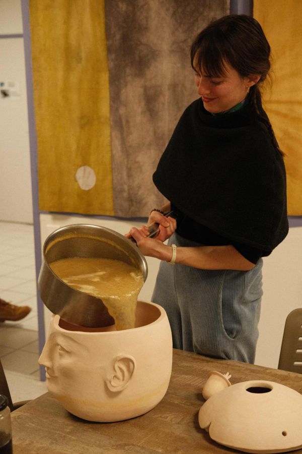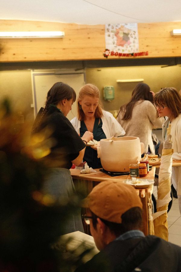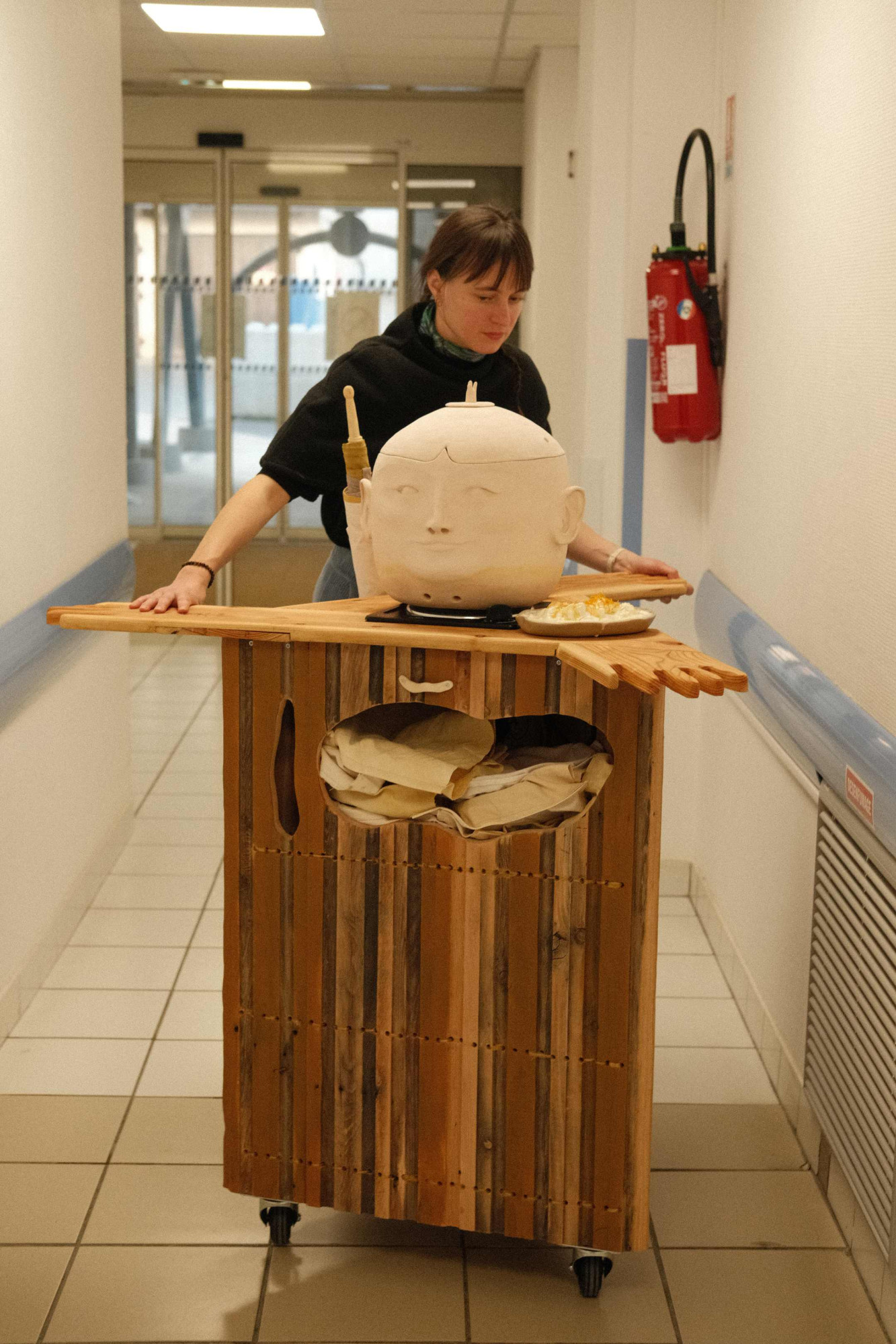 La confidente est une cuisinière mobile, utilisée pour les évènements, les fêtes, les anniversaires. Elle contient une plaque de cuisson, une soupière anthropomorphe, 40 assiettes engobées par les usager·es du centre, des nappes, un guide de fête lui-même contenant des archives du projet, des recettes et contacts des producteurices locaux.