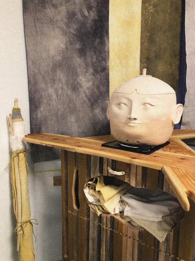 grès + engobe de cueillette = assiettes cuitent au gaz chez Malie, bardage de mélèze assemblé par Charly, bois de noisetier, toile de coton et de lin teints (genévrier, oignons, pignes de mélèze, millepertuis, racine de gaillet et de garance, framboisier, pommier, noisetier, mimosa) plaque de cuisson, soupe de fruits au sirop de genevrier, chouchoux de noix, brioches aux menthes et à l’achillée et au chocolat produites par Caroline, confiture et jus Plantivore et Cueillette en Queyras, yaourt au miel et pétales de soucis.