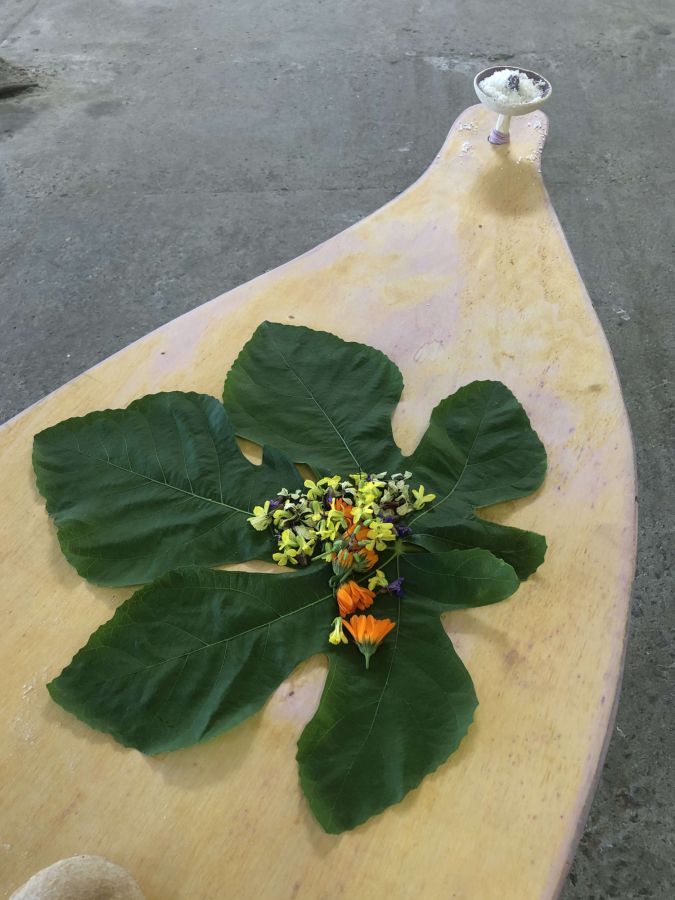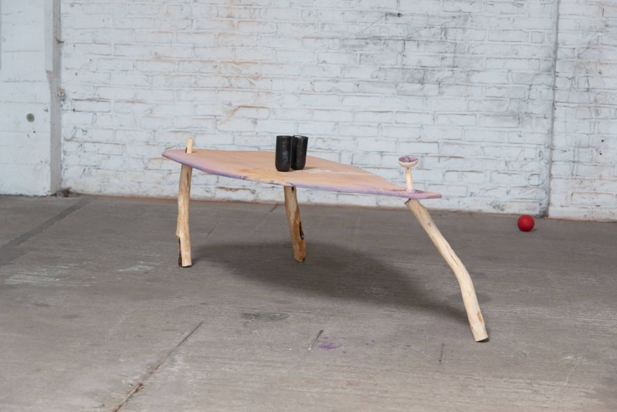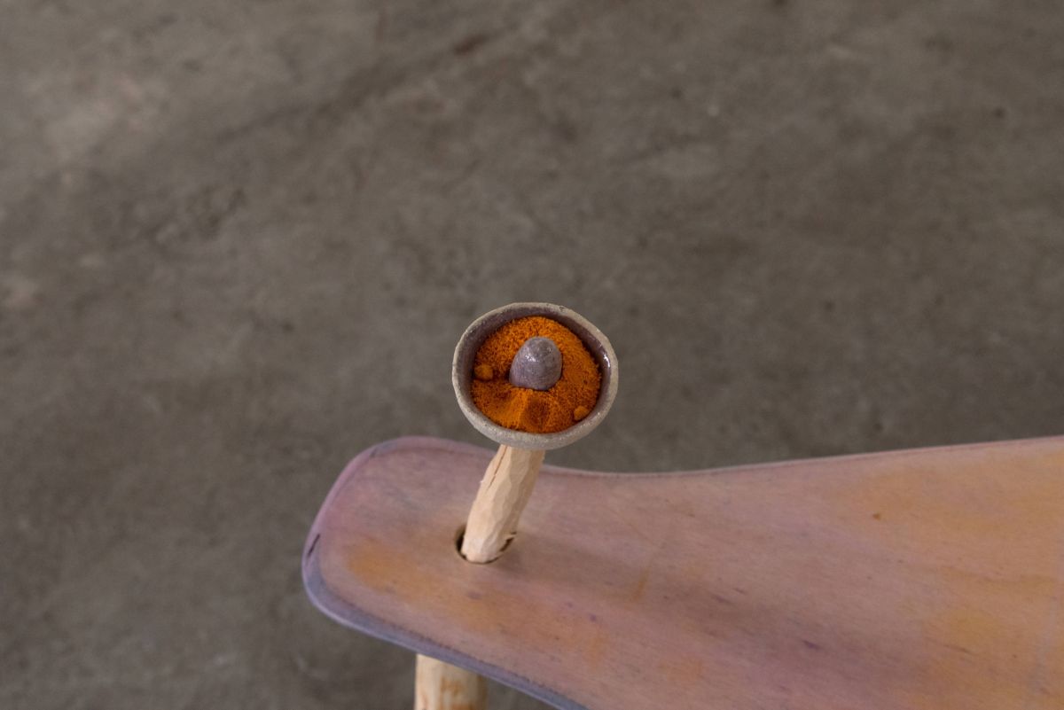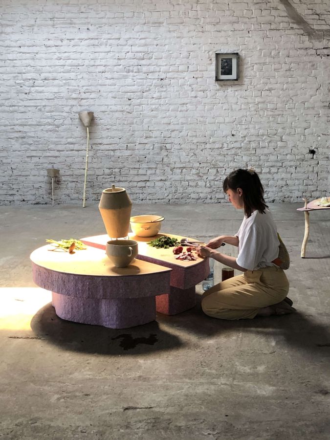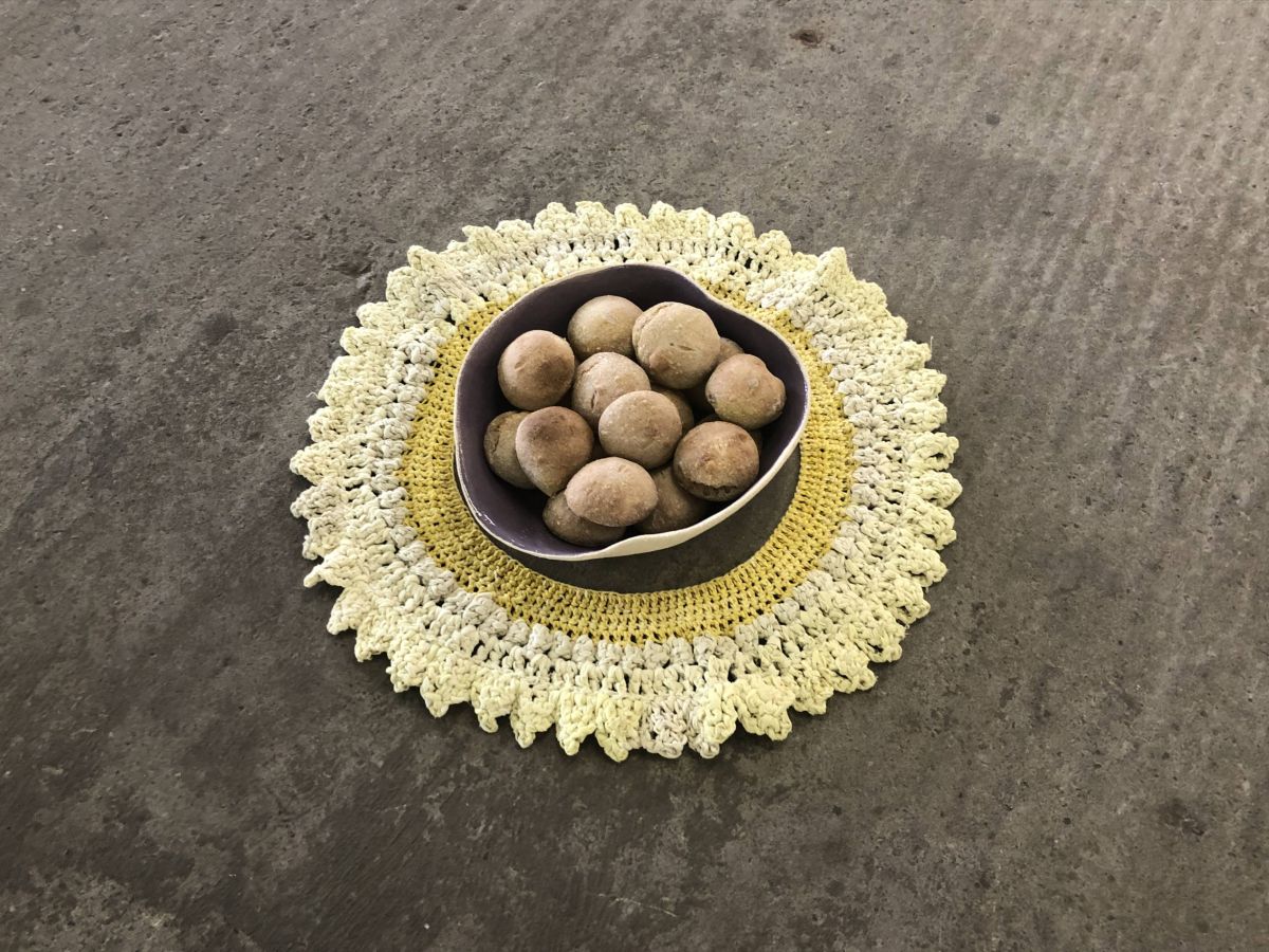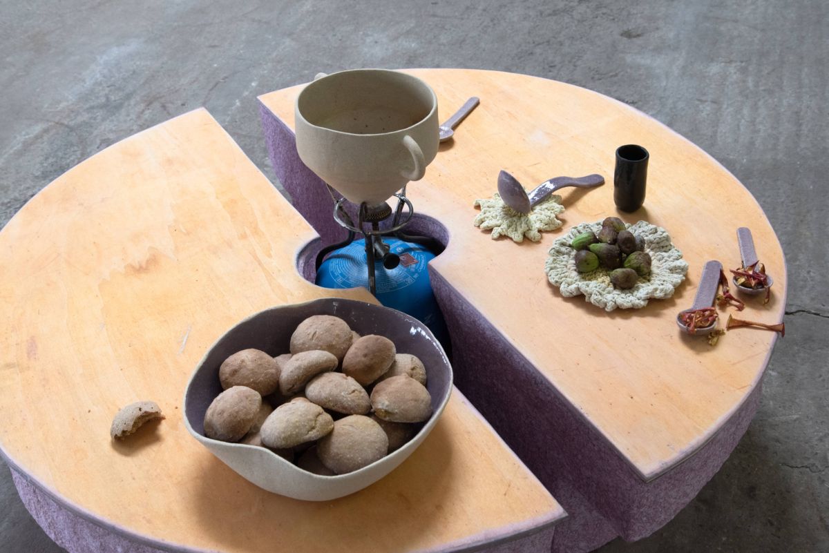 Grès blanc émaillé, grès noir émaillé, carton, papier mâché, butagaz, acier ceintré, bois de prunellier, plateau de peuplier teint au choux rouge, napperon crocheté en lirette de coton teint au genet et pissenlit, corde de coton teinte au curcuma et choux, pigments comestible fait de choux, carrotte violette, curcuma, sel, reste de frigo et de jardin, eau, sirop de houblon, 100 bols de Étienne Mauroy, 100 pains de Abigaël H.