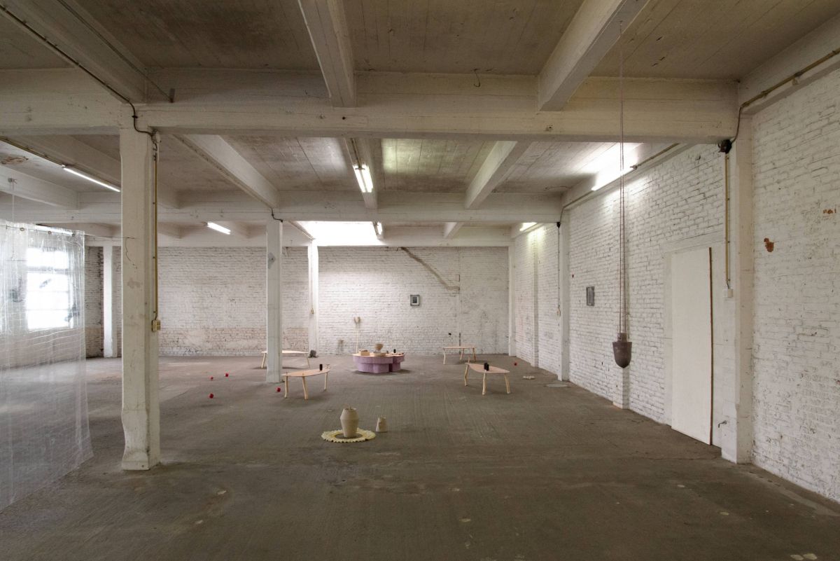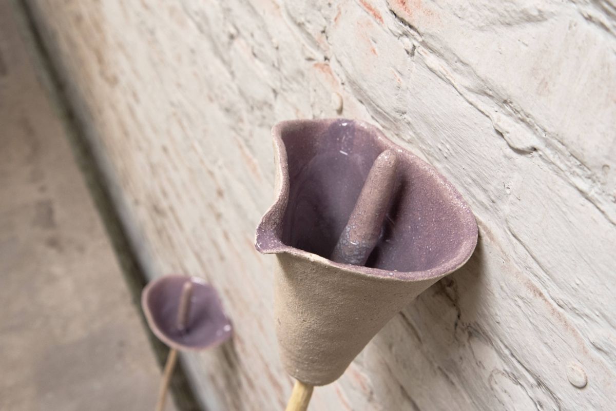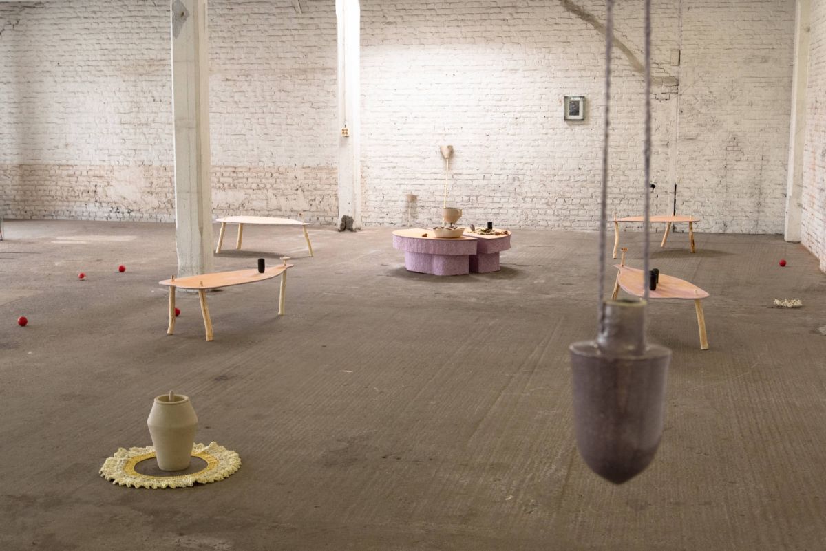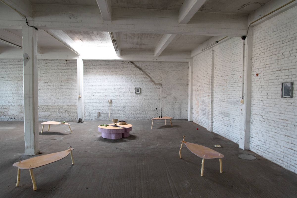 Pour l’exposition collective Ce qu’il faut d’espoir pour mentir, je présentais à Bruxelles dans l’ancienne Brasserie Atlas, une cantine. Les cruches à eaux ont les contours des arums. Dans le flacon en libre service se trouve un sirop de houblon. Les quatre tables teintent aux choux entourent le foyer comme les pétales d’une brassicacée accueillent leur calice. Les gobelets en grès noir sont des anthères gorgées de pollen.
