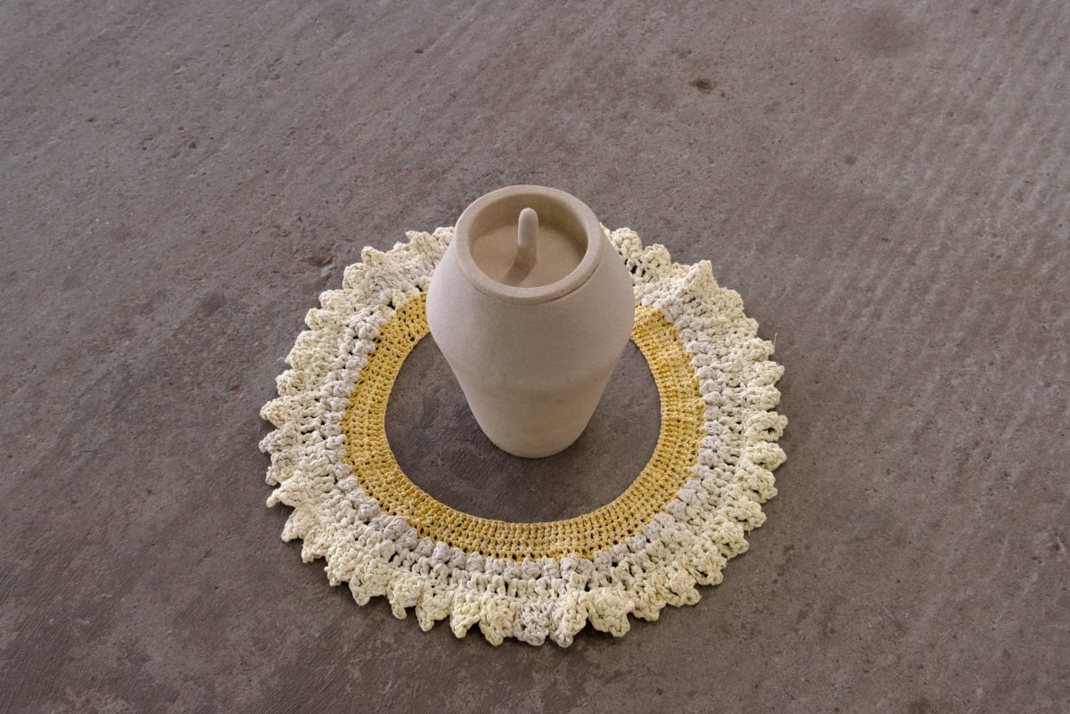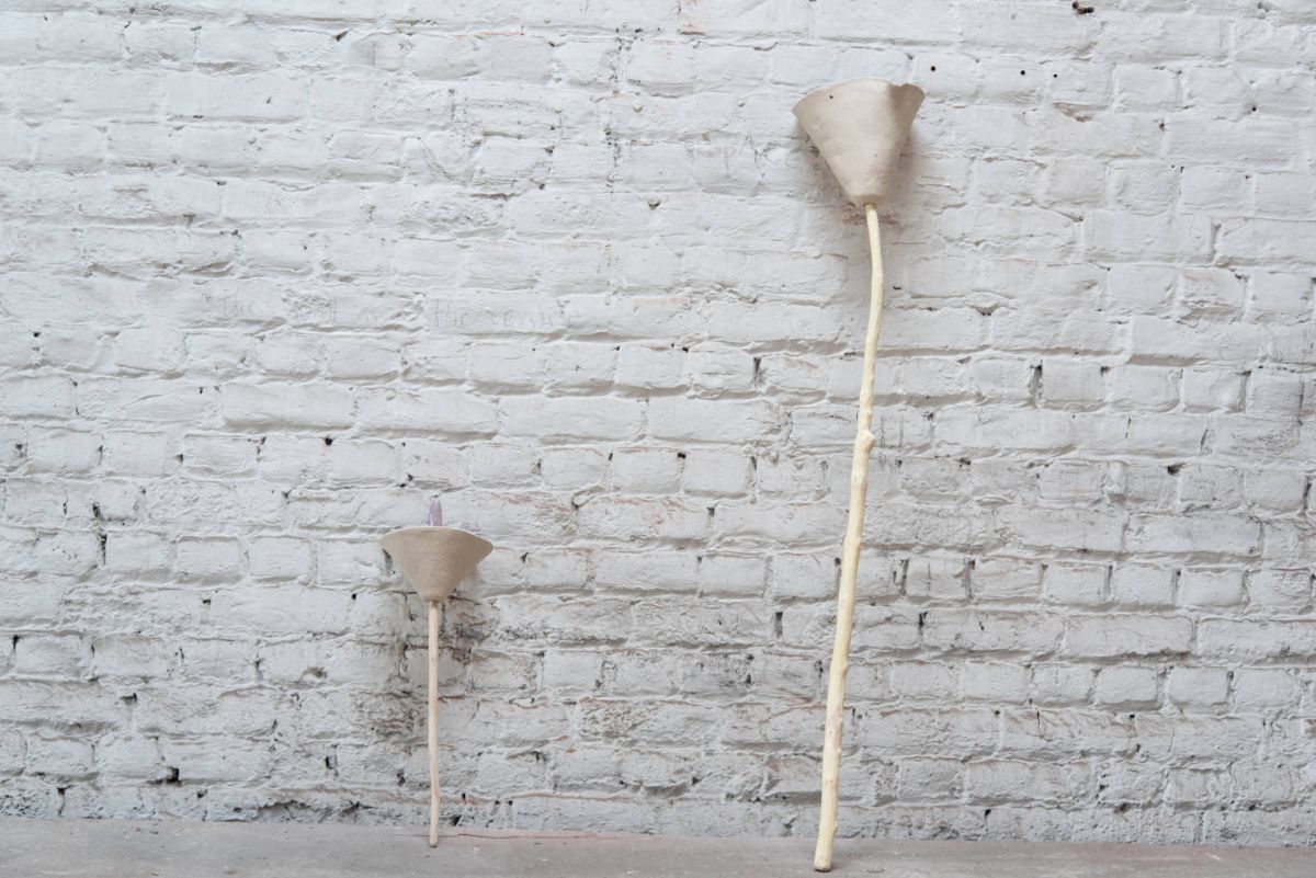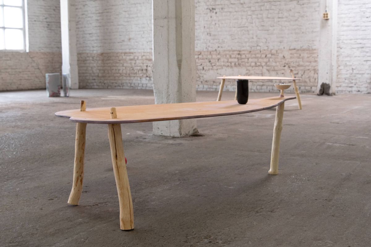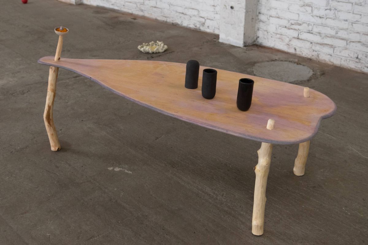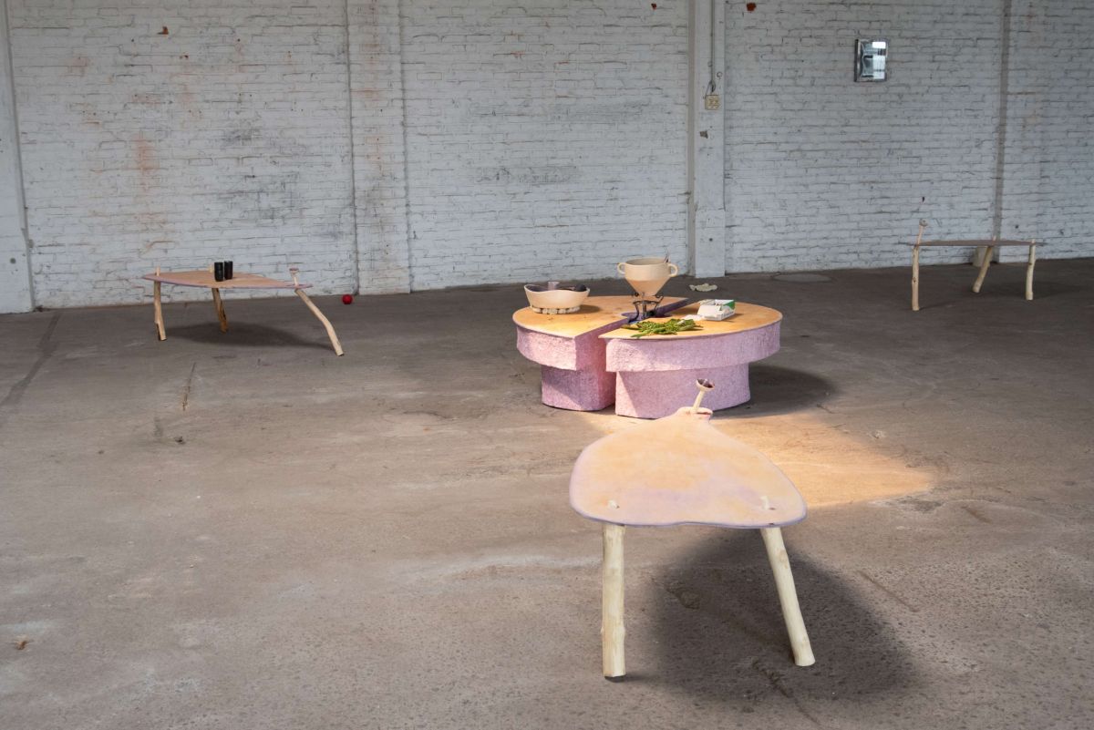 Pour l’exposition collective Ce qu’il faut d’espoir pour mentir, je présentais à Bruxelles dans l’ancienne Brasserie Atlas, une cantine. Les cruches à eaux ont les contours des arums. Dans le flacon en libre service se trouve un sirop de houblon. Les quatre tables teintent aux choux entourent le foyer comme les pétales d’une brassicacée accueillent leur calice. Les gobelets en grès noir sont des anthères gorgées de pollen.