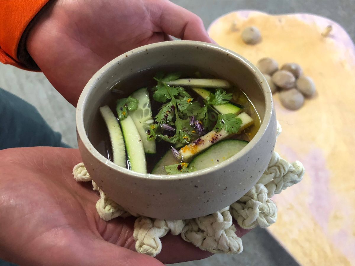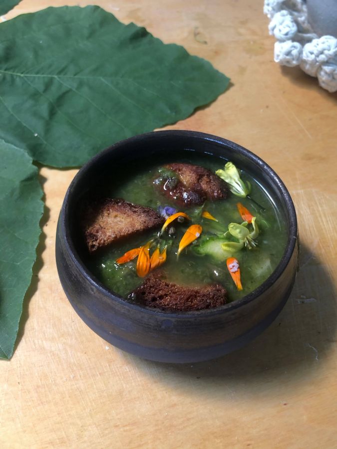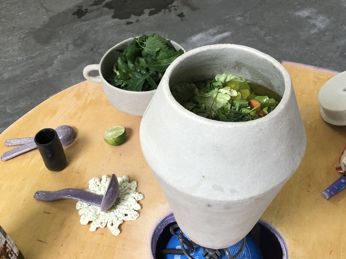 Les soupes cuisinées sur la gazinière au coeur de l’installation sont composées des plantes du jardin et du fond de frigo. Les matériaux des sculptures comme ce qui constituent les mets, sont glanés, retrouvés, récupérés, teints, et mis en forme de nouveaux.