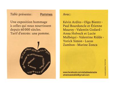 festival de la pomme avec : Kévin Ardito, Olga Bientz, Paul Bourdoncle et Étienne Mauroy, Valentin Godard, Anna Holveck et Lucie Malbéqui, Valentine Ridde, Yorick Simon , Lucas Zambon, Marine Zonca