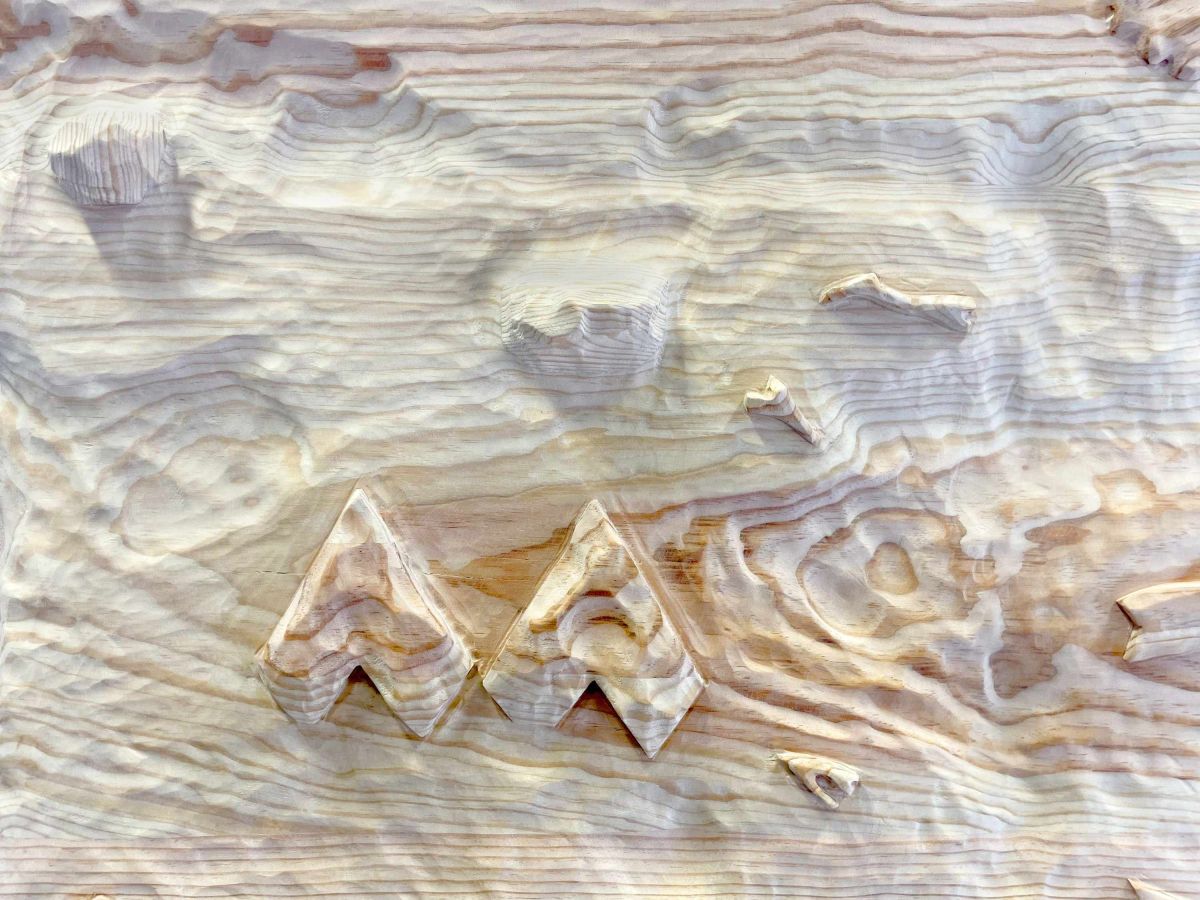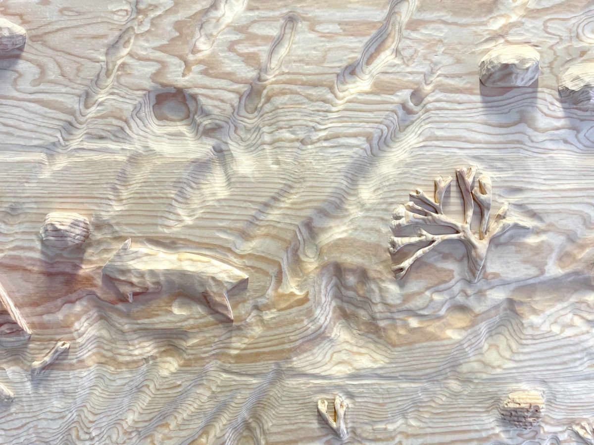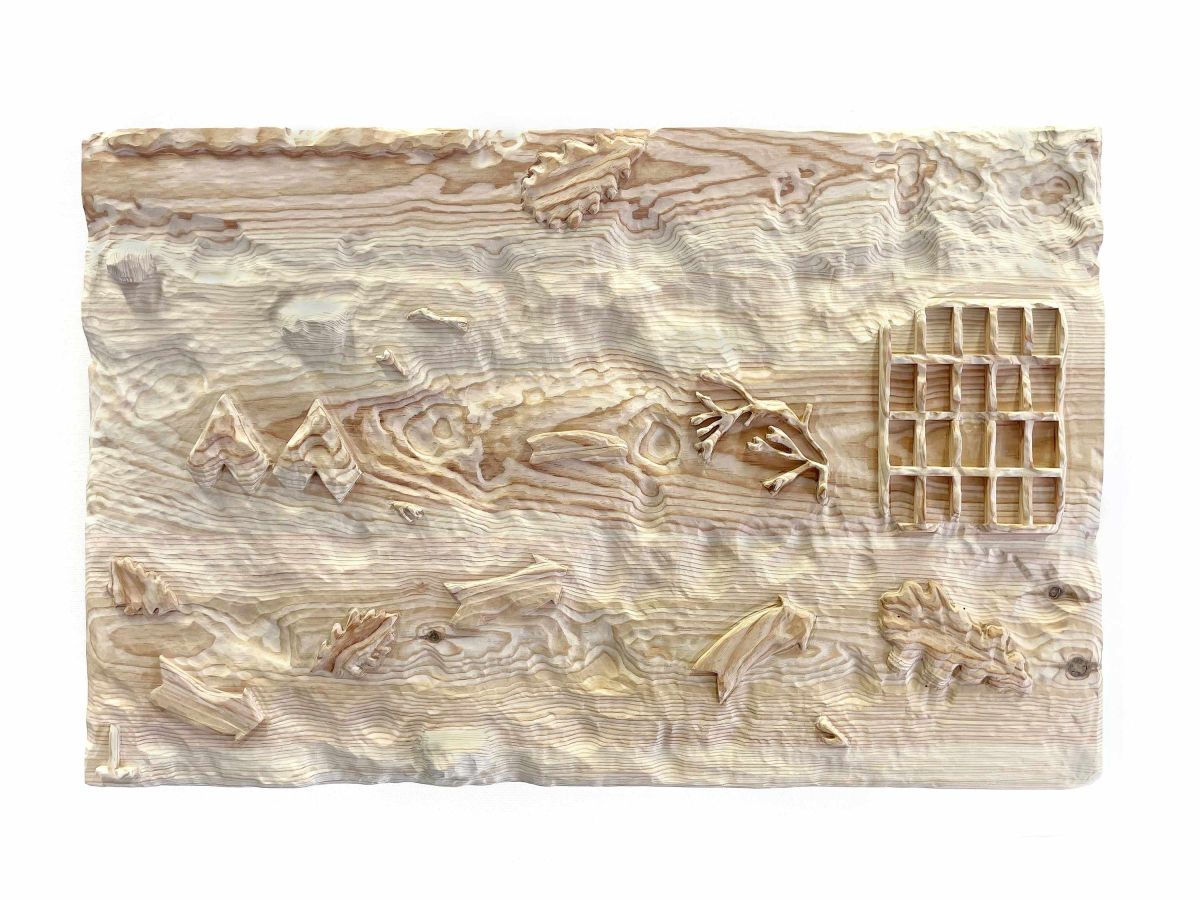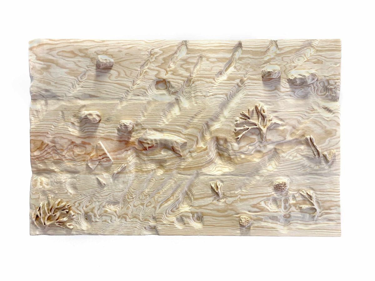 Dans ces fragments sculptés, plusieurs registres visuels se superposent sans ordre établi, composant une image fragmentaire du territoire. Les bas-reliefs en bois évoquent des portions de plage, comme si le sable y avait enfoui et figé, de façon presque fantomatique, les traces d’un paysage en transformation. À mi-chemin entre réalité géographique et fiction, cette série fait dialoguer la mémoire d’un territoire et les transformations qu’il traverse.