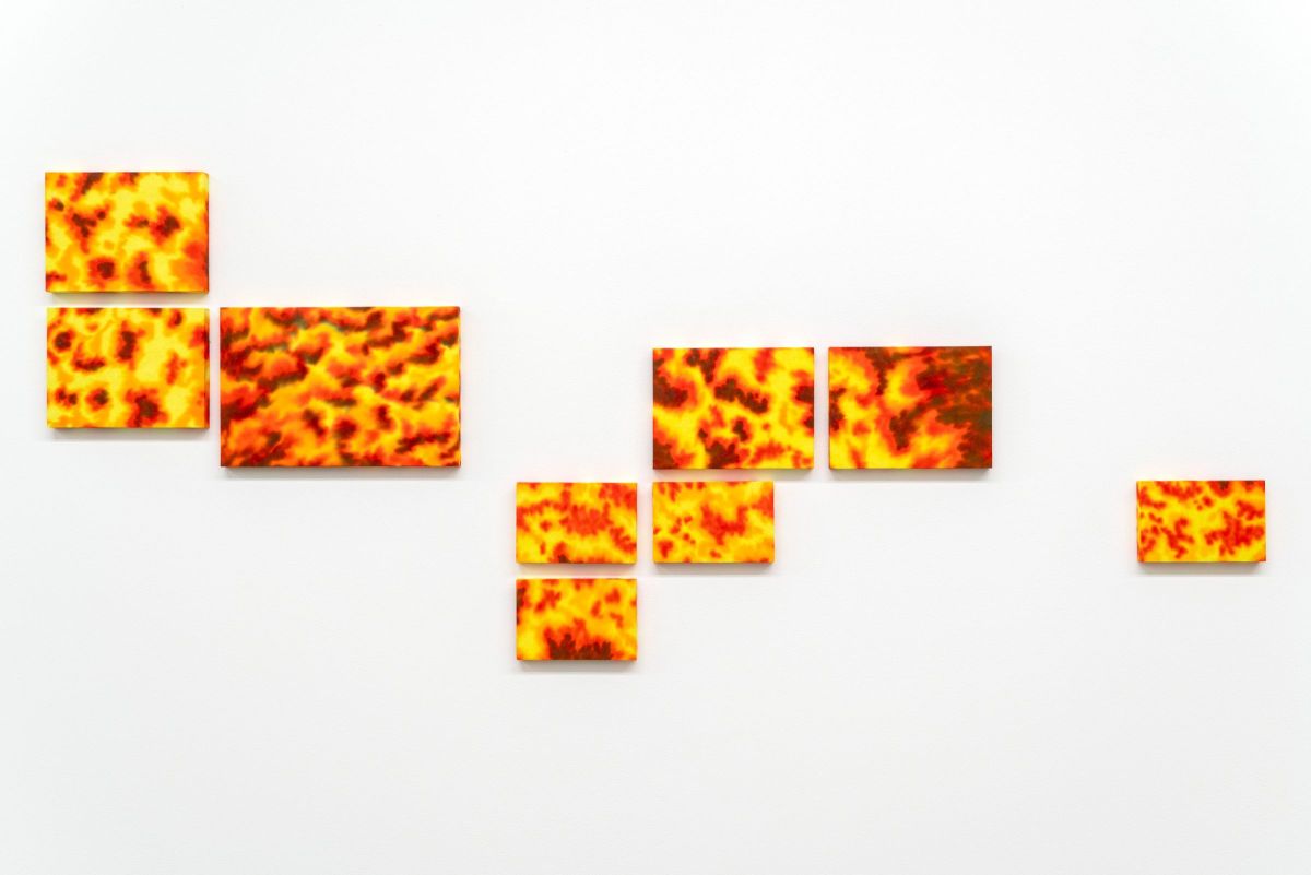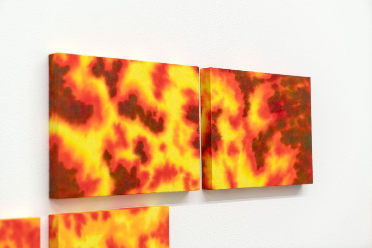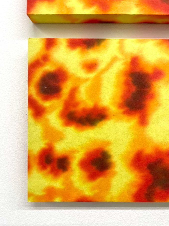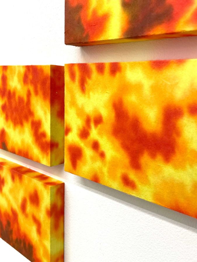 Cette série de dessins est réalisée sur du papier de mûrier, support dont les longues fibres, issues de l’écorce, favorisent une circulation particulière de l’encre. Par capillarité, celle-ci se diffuse lentement et de manière irrégulière à travers le réseau fibreux, créant des formes imprévisibles. Ce phénomène renvoie à la propagation d’un feu : comme les flammes qui se déplacent de façon aléatoire en suivant la matière combustible, l’encre s’étend selon des trajectoires incertaines, produisant des effets de combustion ou de déflagration.