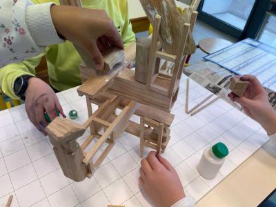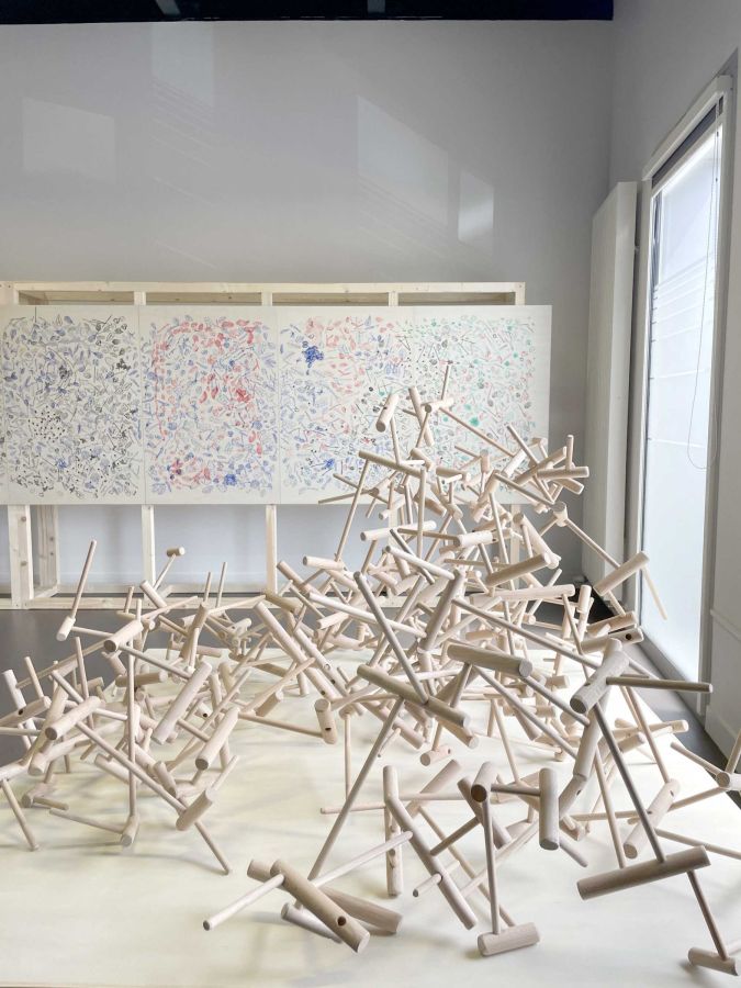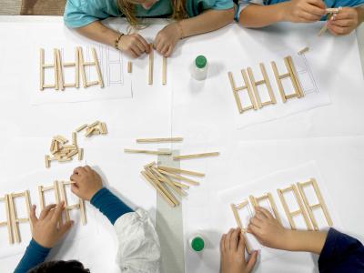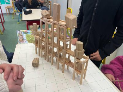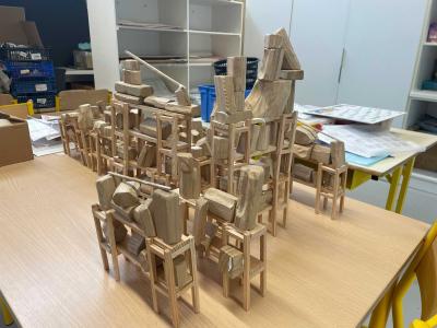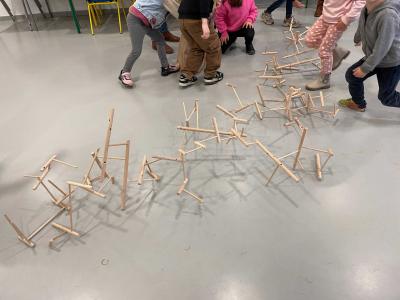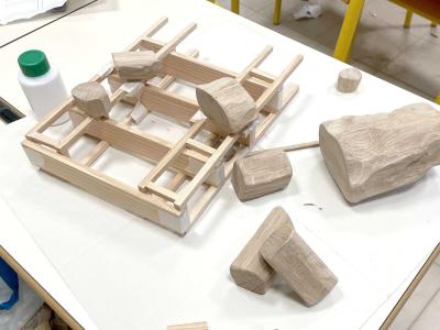 En travaillant avec des essences de bois présentes dans la forêt domaniale des Pays de Monts (chêne, pin maritime), les élèves ont été initiés à la manipulation de formes, selon un ensemble de règles définies. Inspirés par l’observation du territoire, ils ont conçu des maquettes et sculptures en assemblant des morceaux de bois prédécoupés en amont. Les élèves ont expérimenté des principes d’édification en jouant avec l’équilibre, la bascule et la superposition, afin de recréer un paysage imaginaire collectif.