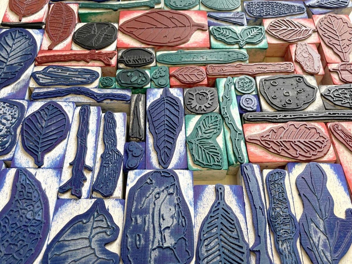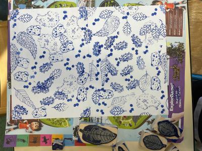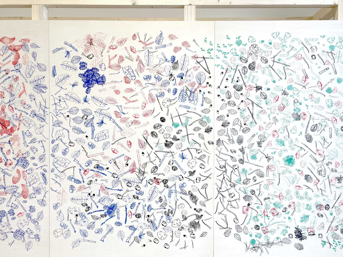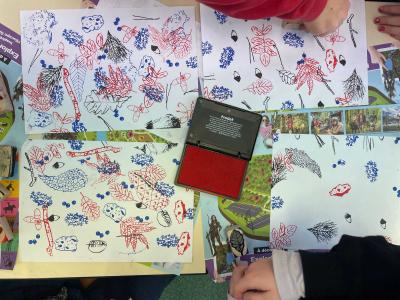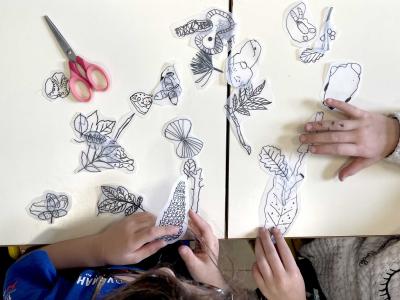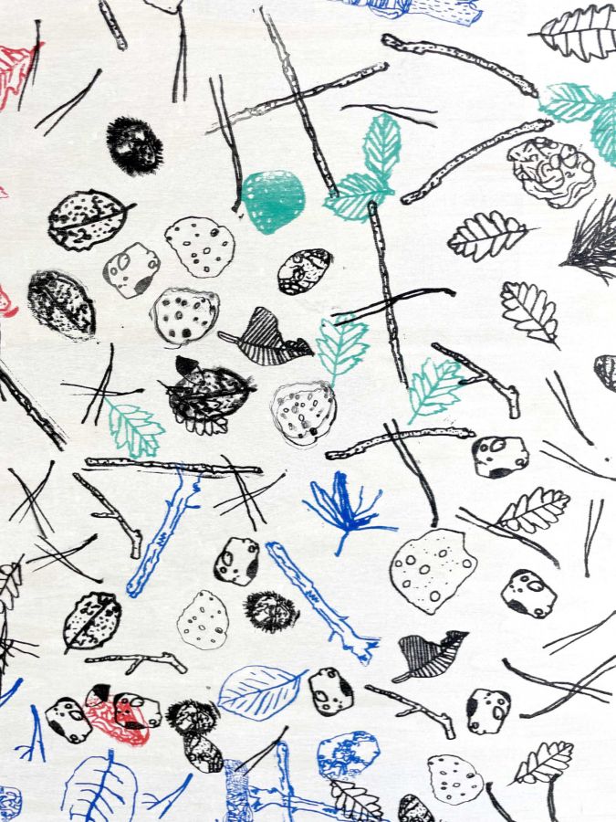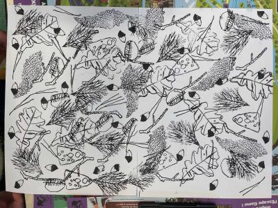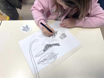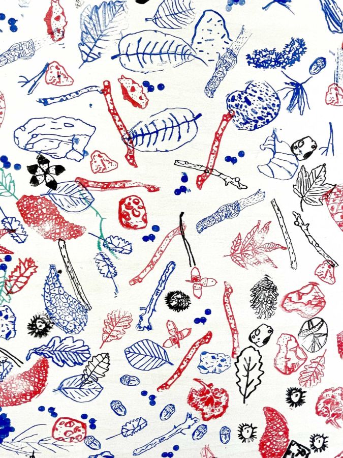 Après l’analyse de différents éléments observés autour du site de Biotopia, les élèves ont réalisé un ensemble de dessins, leur permettant d’étudier et de représenter ce paysage spécifique, situé entre terre et mer. Une sélection de ces dessins a ensuite servi à extraire des motifs significatifs pour la fabrication de tampons encreurs. La phase finale a consisté à produire des dessins collectifs en utilisant ces tampons.