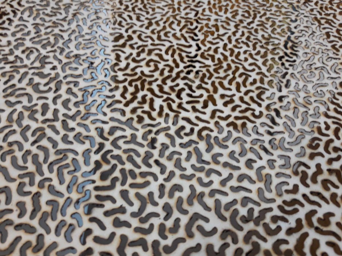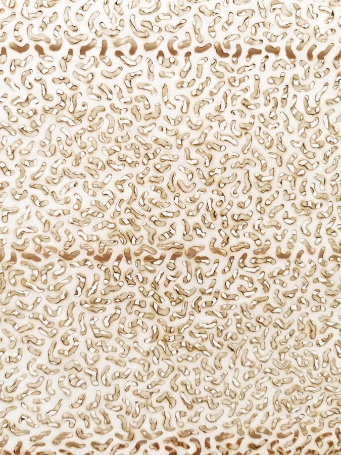 En collectant les feuilles de certaines plantes creusées par des insectes phytophages, je constitue un herbier de ces entailles végétales, révélant ainsi la présence de chenilles, coléoptères, escargots, dont l’existence discrète pour l’œil humain se manifeste par ces cavités dévorées. Par mimétisme avec ces insectes, j’utilise le papier de riz pour figurer un ornement, consommant également son support pour faire image, cette fois-ci par le feu.