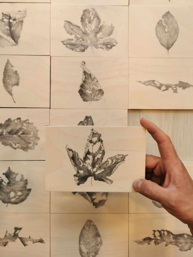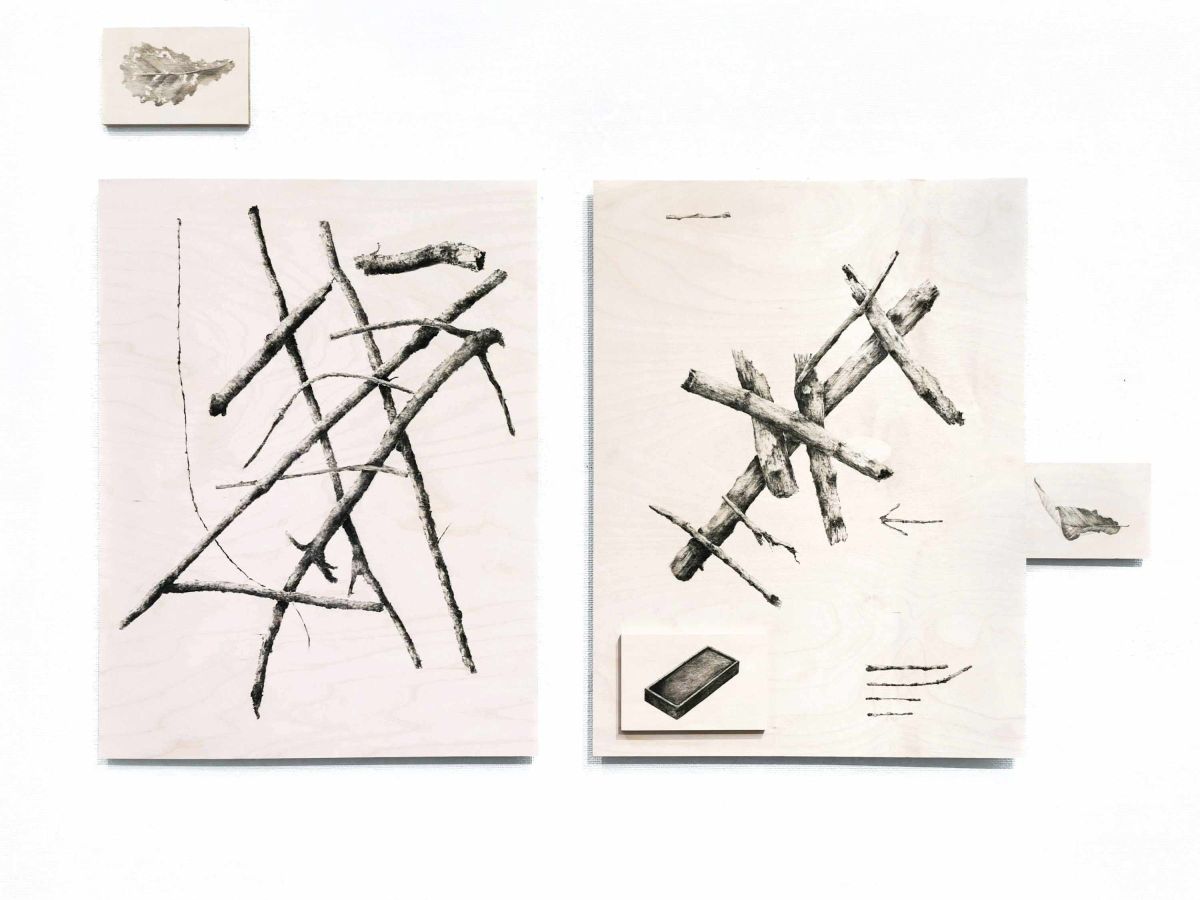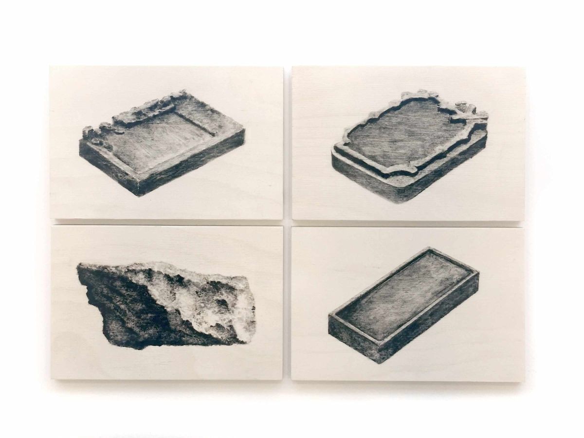 Dessins à la poudre de charbon sur bois, 15 x 20 cm (pièce)