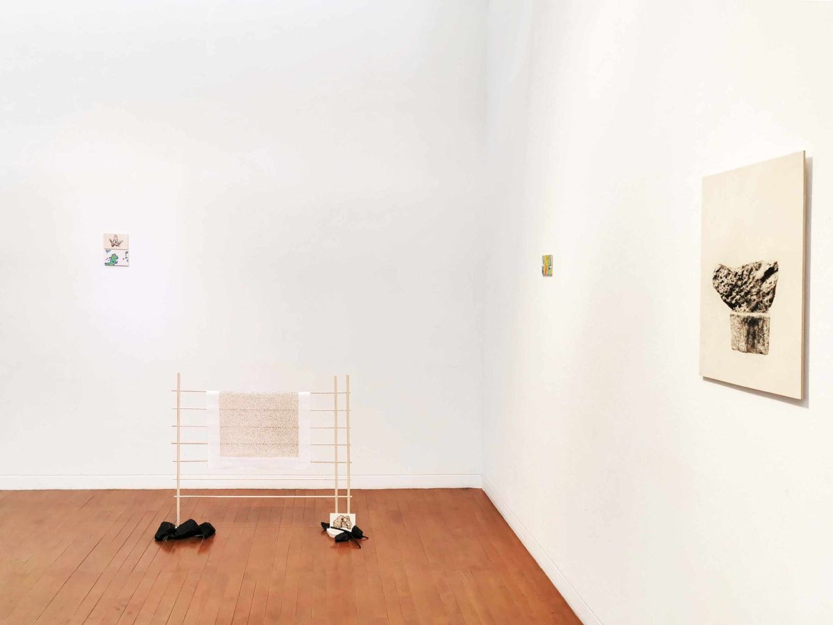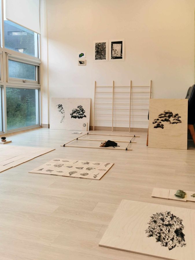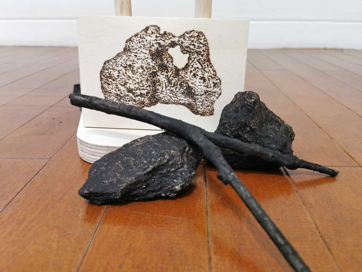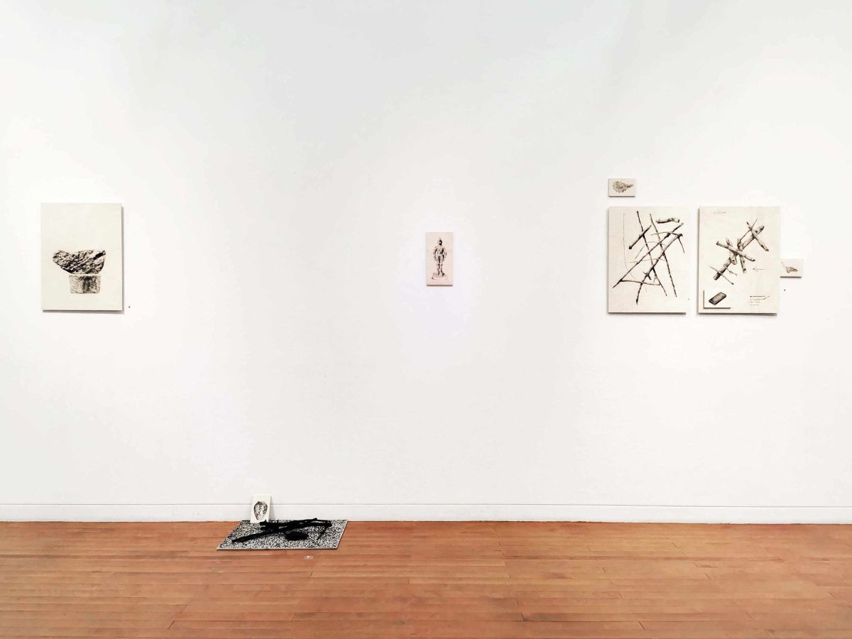 Une installation de dessins au charbon présente des motifs inspirés des Viewing stones (Suseok, en coréen), ces petites pierres choisies et posées sur des socles, évoquant un paysage naturel de plus grande échelle. Les caractéristiques techniques élaborées pour le choix de ces roches - nombre de trous, creux, reliefs, formes - sont ici appliquées à une sélection d’objets divers glanés aux alentours, provoquant un doute sur leur caractère naturel ou artificiel. Une série d’images réalisées à la pierre noire amplifie et documente ces interactions.