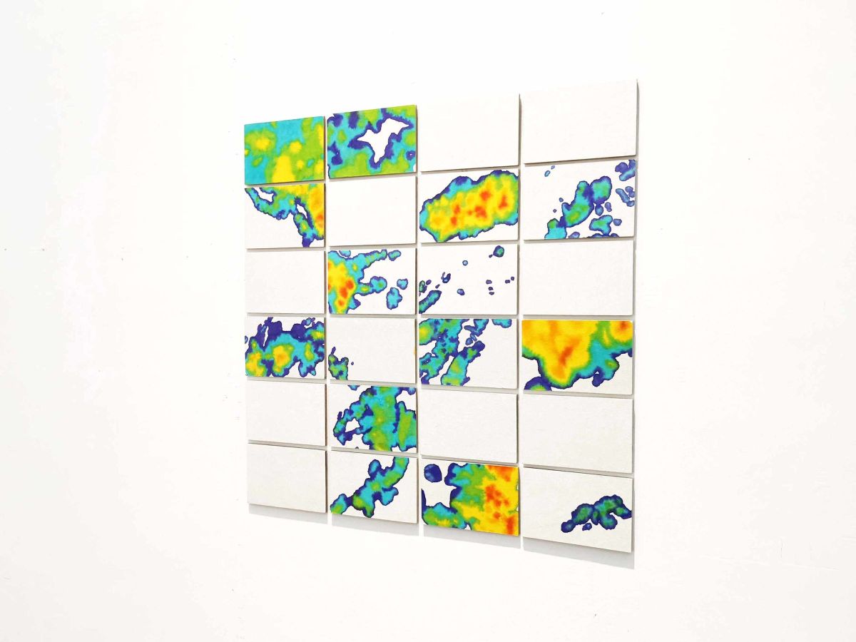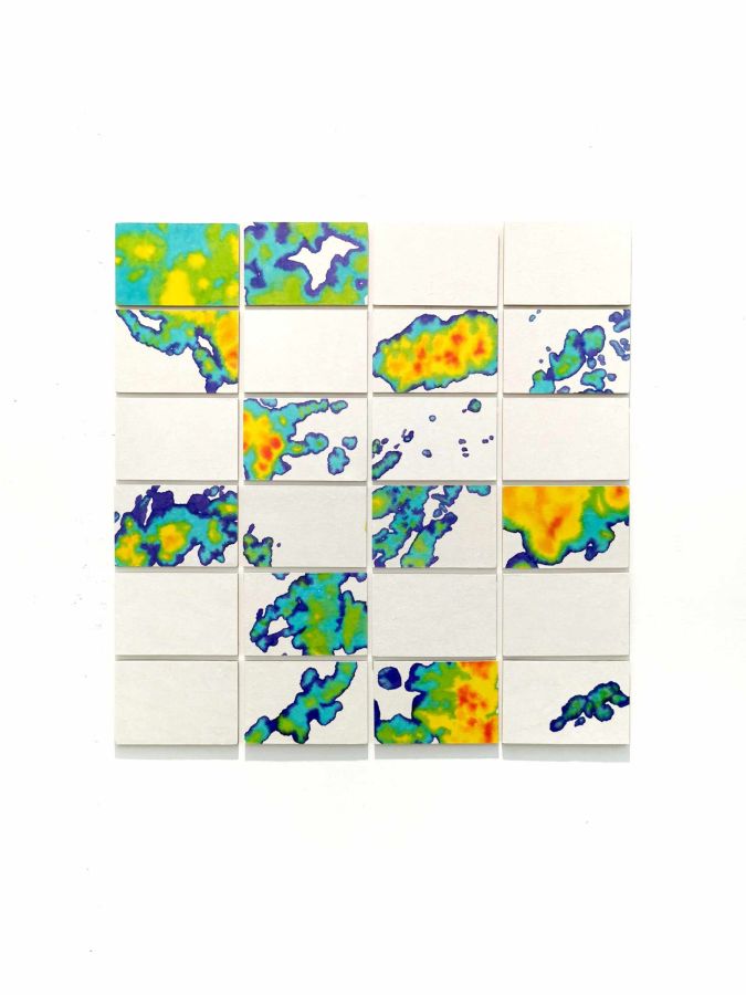 Des dessins réalisés à l’encre convoquent des visuels de radars météorologiques sur les précipitations du mois d’août dans la région. L’espace de la carte saisit le déplacement des masses nuageuses et leur intensité, cette lecture du territoire à une échelle atmosphérique, offre un motif traversant les frontières géopolitiques.