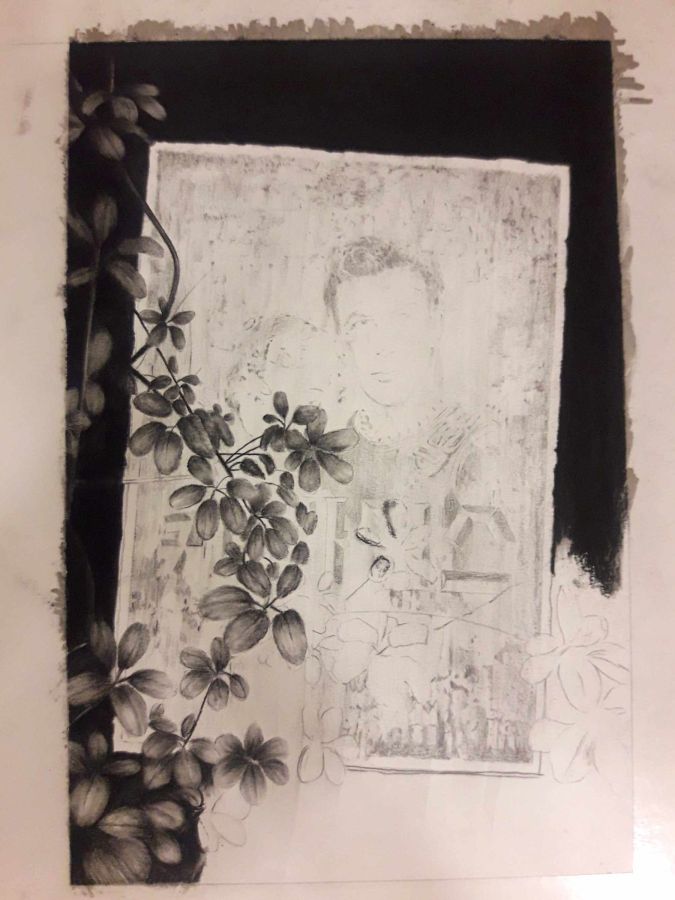 Dessins à la poudre de charbon sur bois, 60 x 45 cm