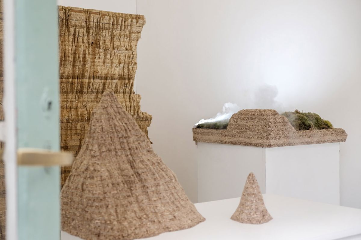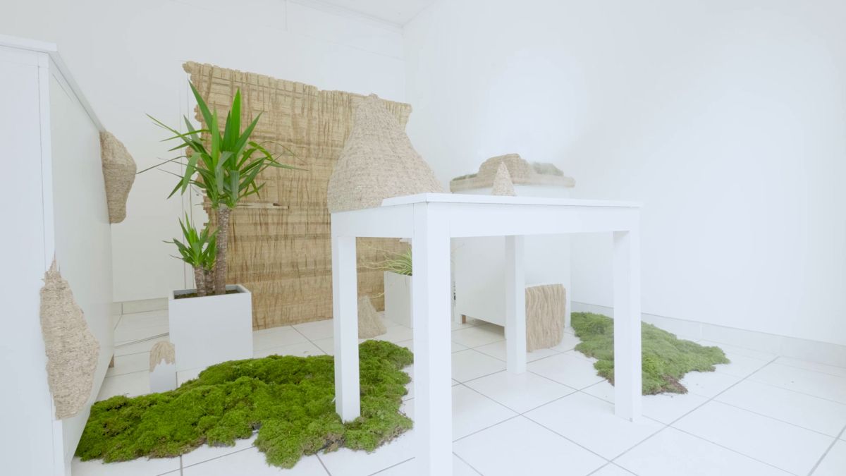 Évoquant le principe du terrarium, l’installation met en scène la lente évolution de matériaux domestiques. Le mobilier blanc se fissure, se déforme, laissant apparaître des formes rugueuses, entre textures organiques et structures minérales. Ces formes dialoguent avec les mousses végétales réparties dans l’espace et sur les sculptures.