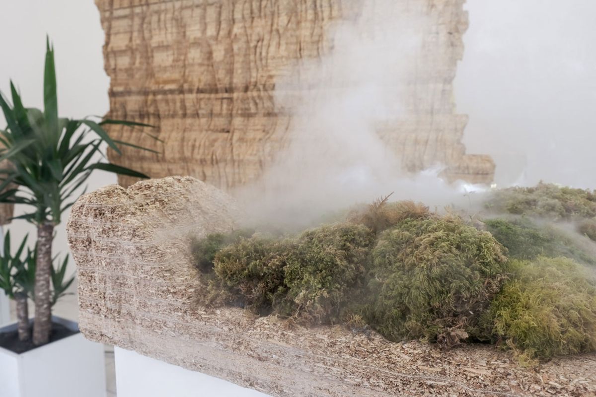 Une fine brume, diffusée en continu, favorise la croissance des mousses et instaure une dimension fictionnelle à ce paysage intérieur.